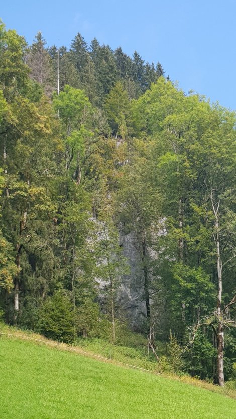 Grauer Stein is a much more friendly affair, with an entry point of 3s and 4s, but with some high quality long slab routes in the 6s and 7s. Again only a few minutes from the parking, but this one really takes some finding. You go through the wooden gate and immediately hop over a wire fence behind the bench to follow a trod, skirting the wood on its left. You carry on along the trod, through a field, passing a dilapidated shed in the woods, and pick up a path heading into the trees, which soon becomes a narrow constructed gangway which accesses the crag.