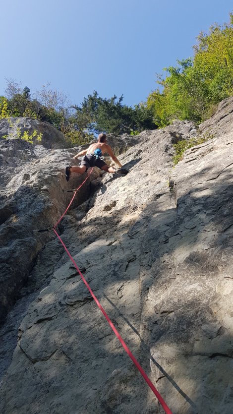Having finally set aside egos, and accepted that we’re operating around the VI to VII+ range (about 5c to 6b+ if you believe the conversions) there isn’t really much on offer (it’s mostly VIII to X), but it’s a 4* crag so we decided to see if the scraps were worth a look. Hinkelstein, 6-, was the obvious starting point: Der Absolute Klassiker und die einfachste Route am Fels! It takes the wide lightning-strike crack just left of me in the photo below – better than it looks and actually quite enjoyable with the benefit of bolt protection.