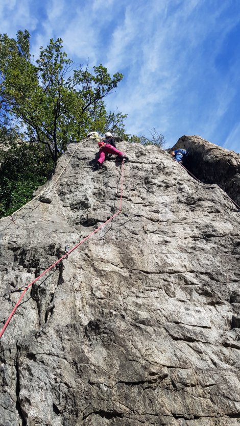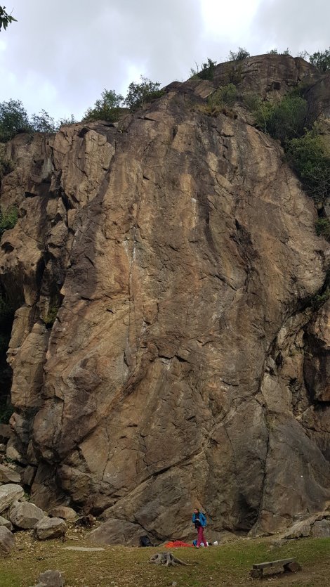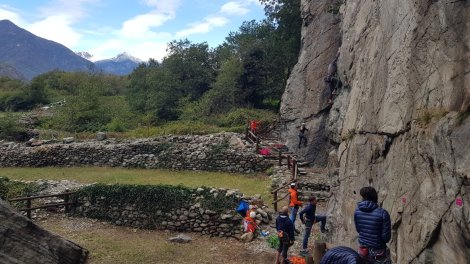 Still chilly but bright the following day so we stay in the lower valley and visit another convenience crag. Montestrutto is the kind of crag I’d normally avoid like the plague (a phrase which has taken on a more immediate meaning in recent times!). It’s part of a developed recreational area, complete with sports field, picnic tables and a kids high ropes area. It’s even got its own bar (okay perhaps that’s a bonus!).
