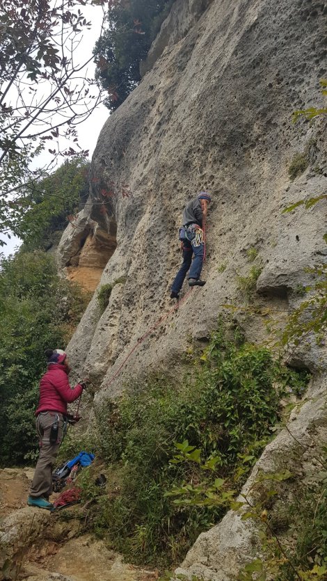 The recommended parking is, somewhat bizarrely, right next to the Autostrada (though you approach on a side road from underneath it) but we found that intrepid locals, with their battered Fiats, had braved the rutted dirt track to save a few minutes. There are a dozen or more sectors, and the guidebook overview map isn’t hugely helpful, so we just stumbled up to the first decent bit of rock and asked a local if they knew where we were. This happened to be Ombre Blu, which turned out to be a decent choice. A tough warmup on Per Jessica, 6a+, before wandering up to the left end of the wall to do most of the routes on what looks to be a newly developed sector. Ratafia, 6a, was a bit more straight forward…