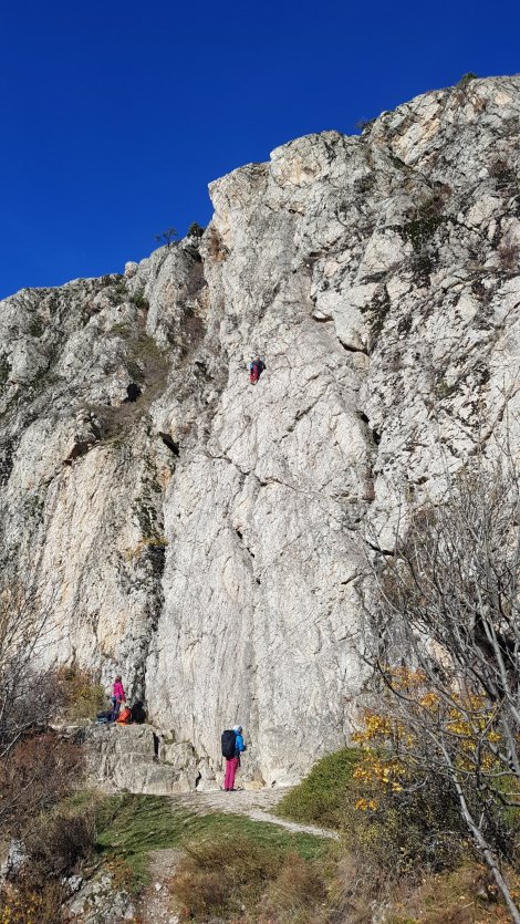 By now the Sunday crew had started to arrive, and families with elaborate (and tempting-looking) lunches and clad in much Decathlon insulation started to colonise the crag from its righthand extremity. We decided to head around the corner to the Face Sud (Quand on a l’amour).
