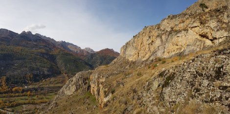 Rocher Baron has a third, less-visited, Face Ouest. This is accessed via a cairned path followed by a series of cable-protected ledge-shuffles, which bring you out on an exposed slope above the main Durance valley, with views down towards L’Argentière. Despite the proximity of the road a few hundred metres below, the position feels almost Alpine and the rock certainly has a less-travelled quality.