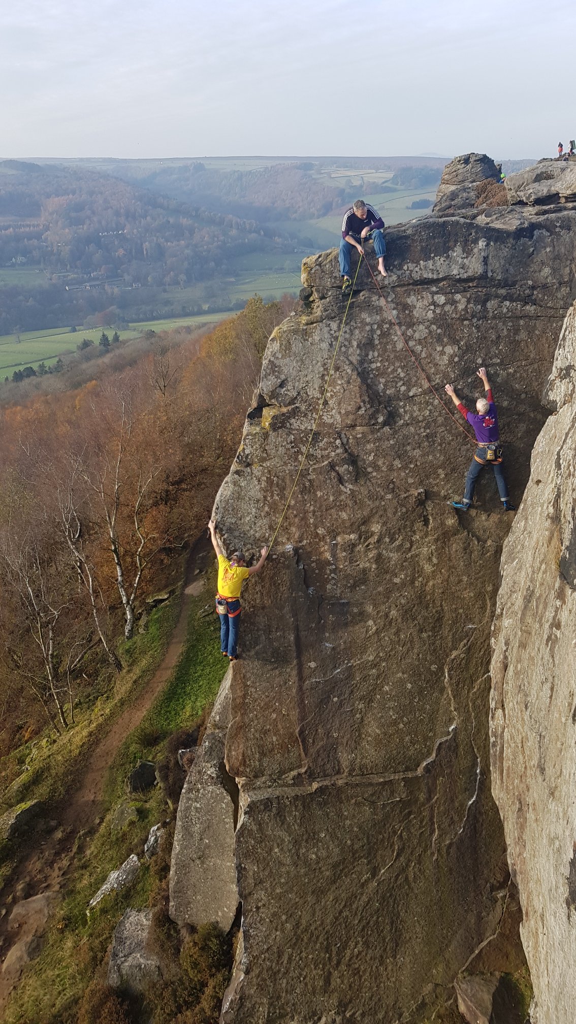 Our reward for sticking it out was a damp ascent of The Traditional Climb, VS, but a bit spicier in the conditions, by which time a gap in the clouds afforded a spectacular late burst of sunshine.
