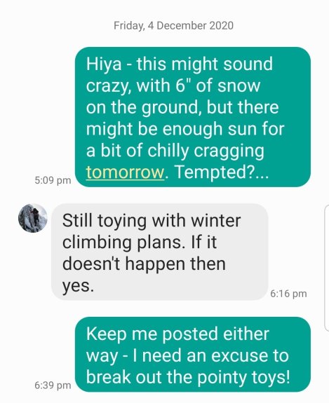 A few further texts were exchanged with my winter climbing mentor and established that Big Boots and crampons wouldn’t be required and a single axe would suffice, “… just throw in a short rope and a couple of slings”.