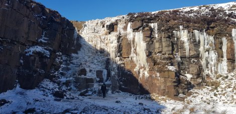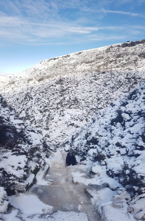 All good things must come to an end, and the Big Freeze was forecast to become the Big Melt as temperatures would nose above zero on Sunday before soaring into double figures in the following week. Phew, time to pack away the spiky toys for another year and enjoy a rest day – that was until Dave phoned. Did I fancy an evening dash up to The Downfall? Don’t be daft, was my immediate response (it was 3pm on the afternoon after our Wildboar Clough trip). However, it did look like an early start the following day (Sunday) might just beat the melt-down – we’d just need to man up to contend with the 60mph gusts and wind chill down to – 15C!