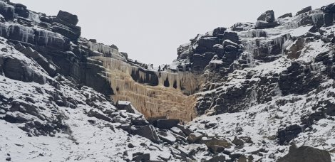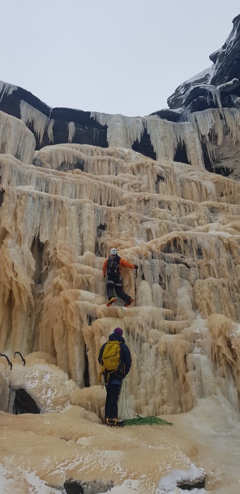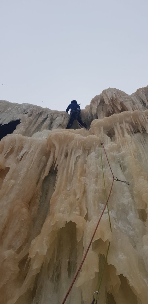 A fine lead with a couple of committing steep pulls on already deteriorating ice.