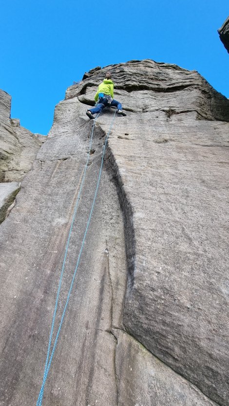 Plenty of boulderers around, but no one else keen / foolhardy (delete as applicable) enough to be roping up. I warm up (figuratively only) on the classic MVS Long Climb, which feels awkward enough with frozen hands. Jake cruises The Shelf, E2 5b
