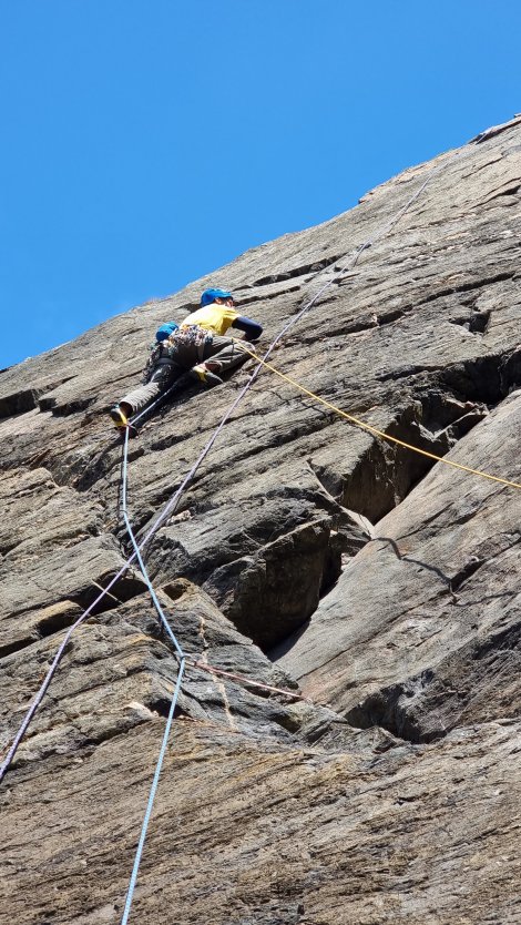 The Shield is tough for E1 5a, with the move off the 2/3rds height stance being quite sketchy, passing a rusted stump marking what was once a peg (better to do it in a single pitch as we did). The thin headwall is absolutely outstanding though.
