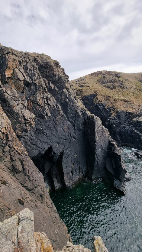 is the perfect spot for some sheltered warmth – a 40m sheet of sculpted kilas slate, set well above the sea and with a friendly ledge at its base. A bit crumbly at the top of the descent, so well worth setting up an ab from the obvious block – we had a 70m but 60m should do.