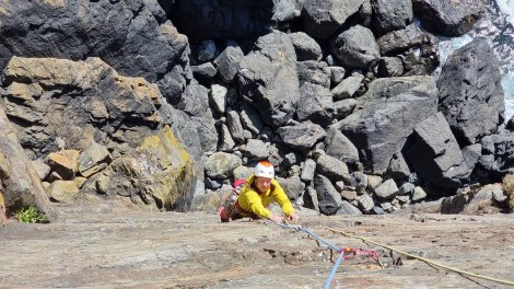 The final pitch could hardly be more of a contrast – from vertical crimpy wall to overhanging butch crack. The first half of this succumbs to a heelhook and big pull, but I end up weighting the rope to place a fat cam to protect the final pop for the top. It needs a committed slap, and I was very glad of the gear. Not perfect style but very pleased to have covered the ground. Here’s a view from the top, and you can just about make out the chalk on the black rock.