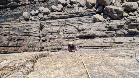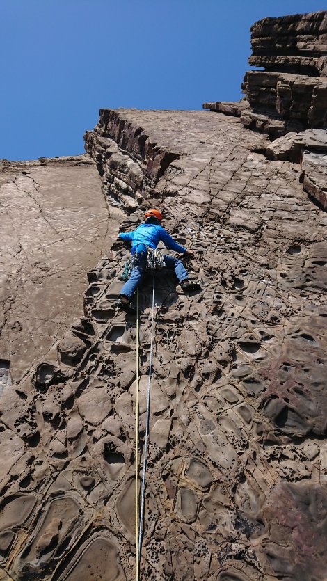 Topping out you do appreciate the Jenga block nature of the top couple of metres of the cliff at this point, and much care and trepidation is required in setting up a belay.