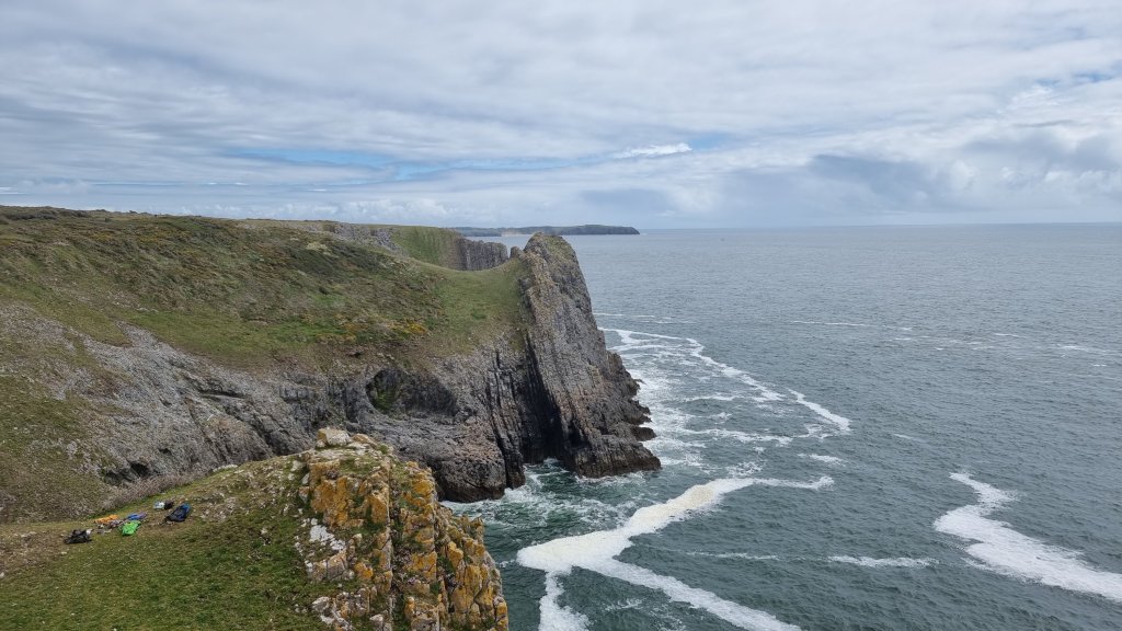 It is a very narrow slot, sliced perpendicularly into the seaward end of Frontier Zawn (itself hardly in the Pembroke mainstream – see post link above). Lurking in this dingy slot is one of the best bits of rock in the area; a 40m gently overhanging wall, with very little in the way of features or holds.