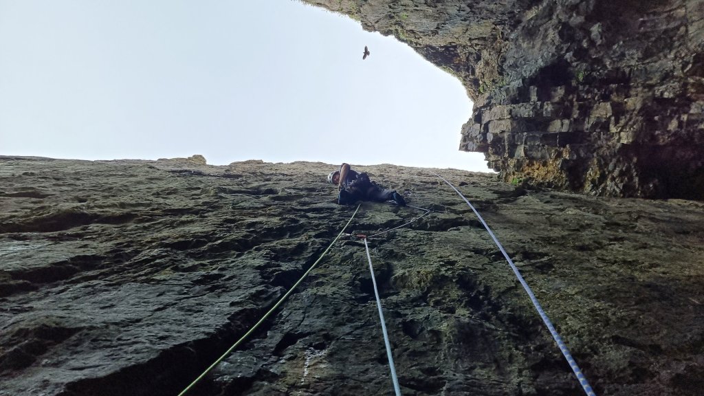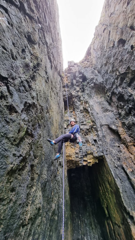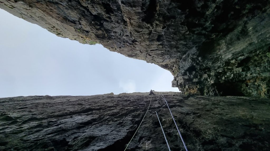 … I felt the first spots of rain. Helen had used her weather wisdom to predict this shortly before I stepped over the edge with a cheery: “it’ll be fine” and I spent a few anxious minutes at the bottom wondering if she’d retreated to the car thinking: “I told him…”. I was relieved when she appeared on the ab line and we were both rewarded by the drizzle passing.