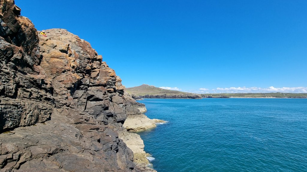 There’s a whole series of crags scattered around this most westerly bit of Wales, and surprisingly they’re composed of the finest gabbro (a rough granite synonymous with the Black Cuillin on Skye). Craig Coetan has the benefit of being West facing (despite being on the North of the headland) and being big enough to have a substantial non-tidal upper tier (because inevitably it was all still a bit splashy!) Unlike many seacliffs, this one’s a doddle to find – marked by the Coetan Arthur dolmen, also known as Arthur’s Quoit – Wikipedia describes it as the remains of a Neolithic burial chamber dating from around 3000 BCE, but I rather suspect it’s the oldest example of a crag cairn marker. You can see it for miles…