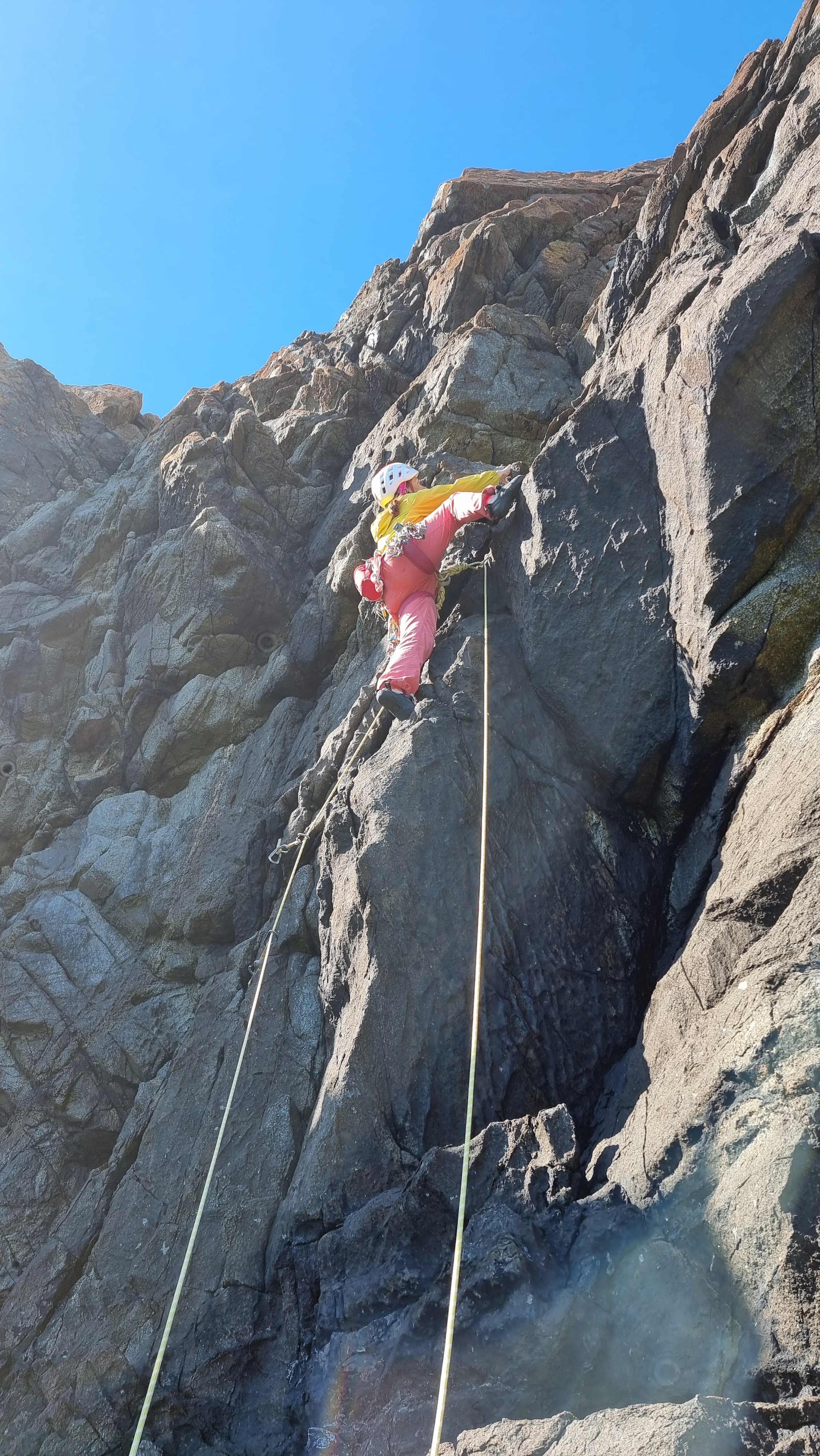 … and looking up we’d got a bunch of 50m 2-pitch routes to choose from. Surely the weather gods had had enough of toying with us by now!