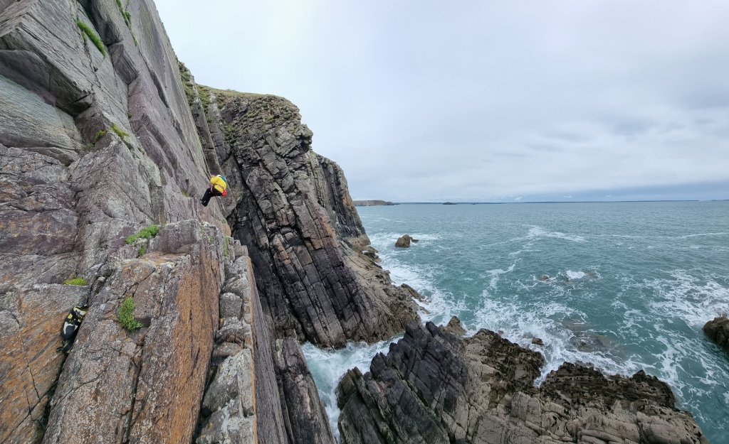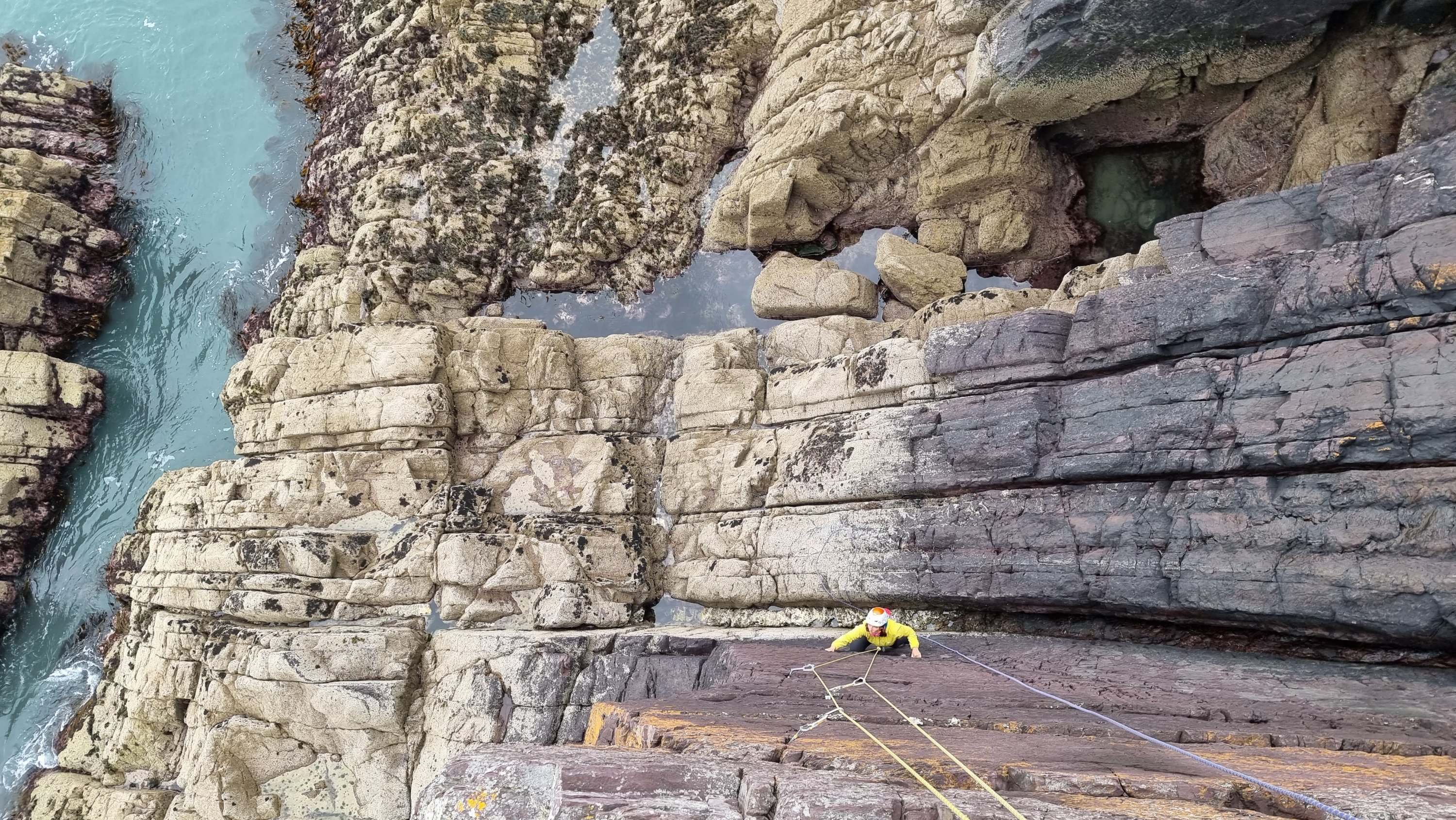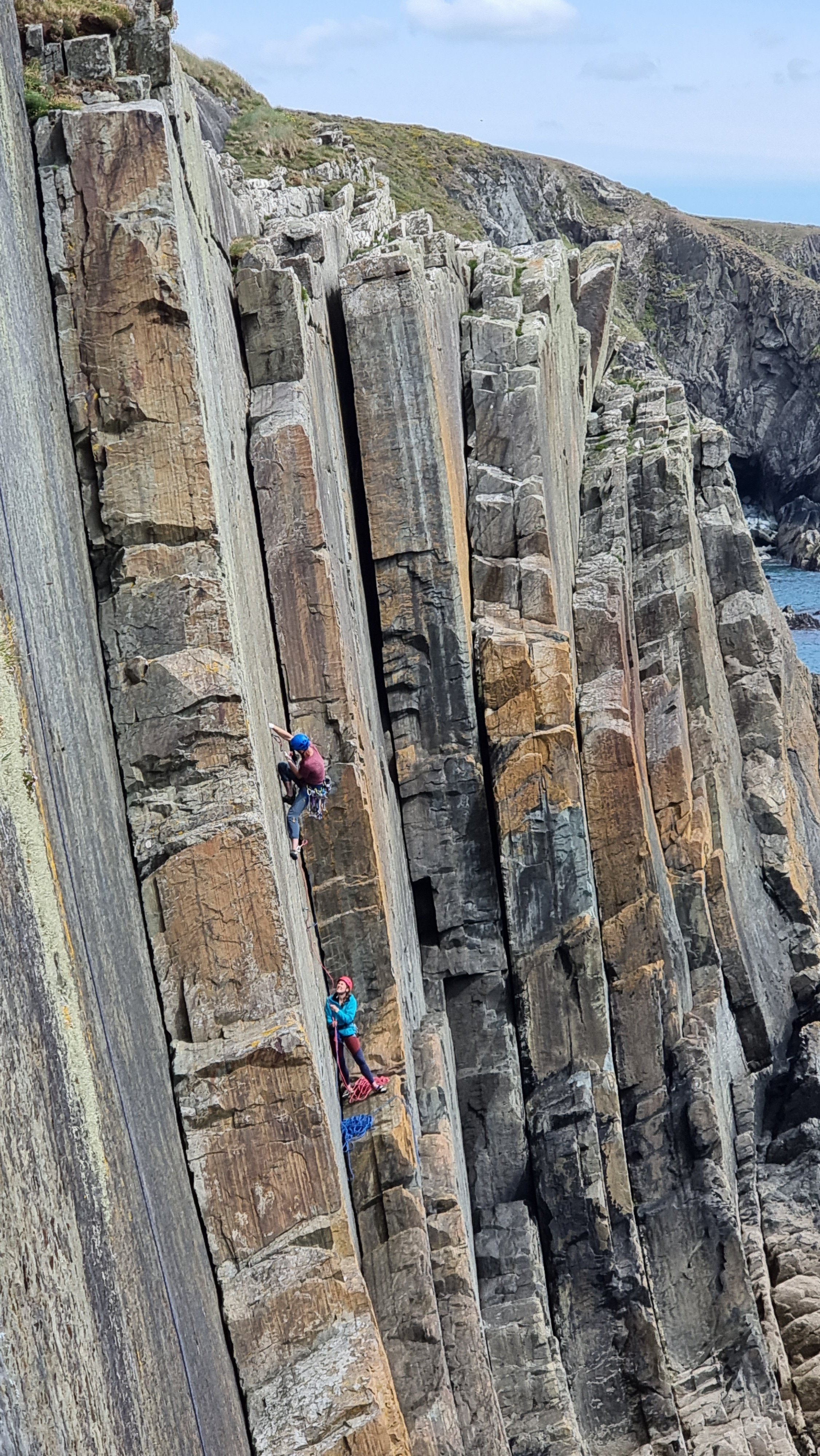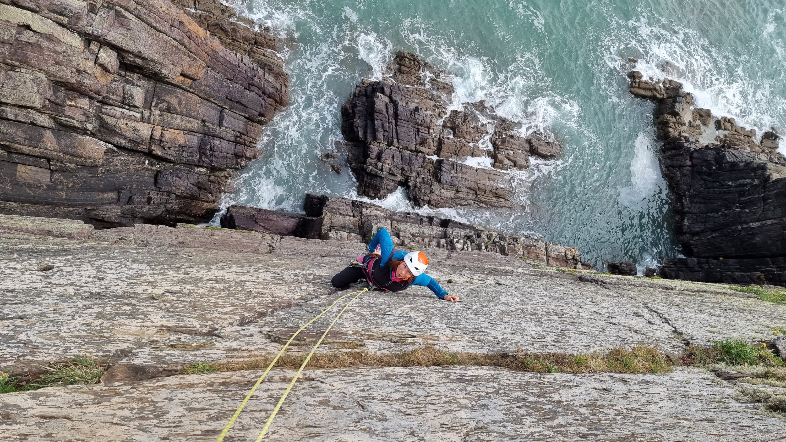 The climbing along the coastline to the south of the St David’s (the UK’s smallest city, if you didn’t already know) is mostly on sandstone slabs, of varying colours and angles, and characterised by crimpy and edgy smoothness, splintered with raggedy cracks.
