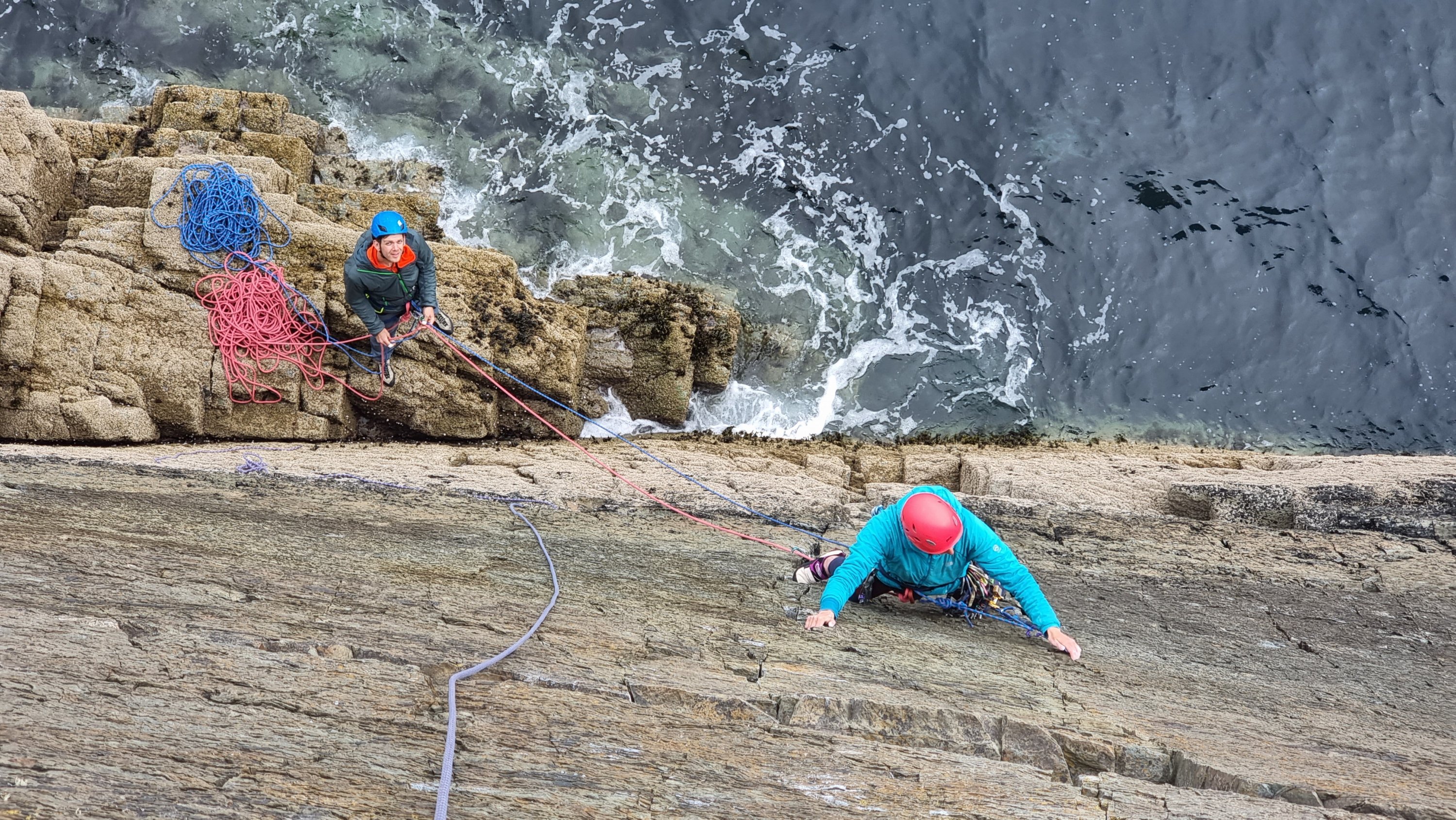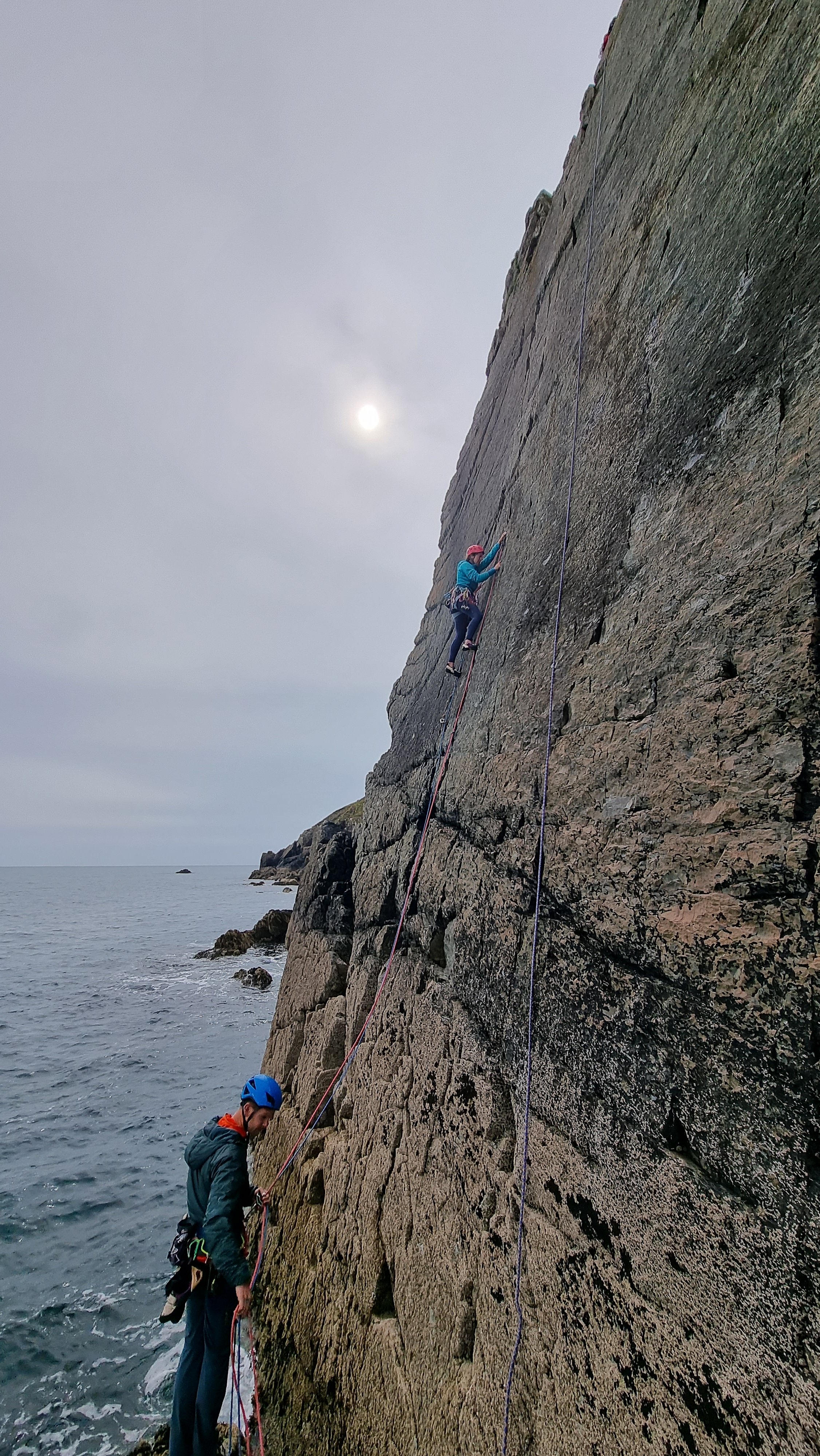 We did a couple of the routes on the main face (foreground below), taking advantage of the low tide to add the final two ticks to complete the set with Be Brave (E1, which actually isn’t too scary) and Be Clever (E2, which requires thought on a very hard but well-protected crux)