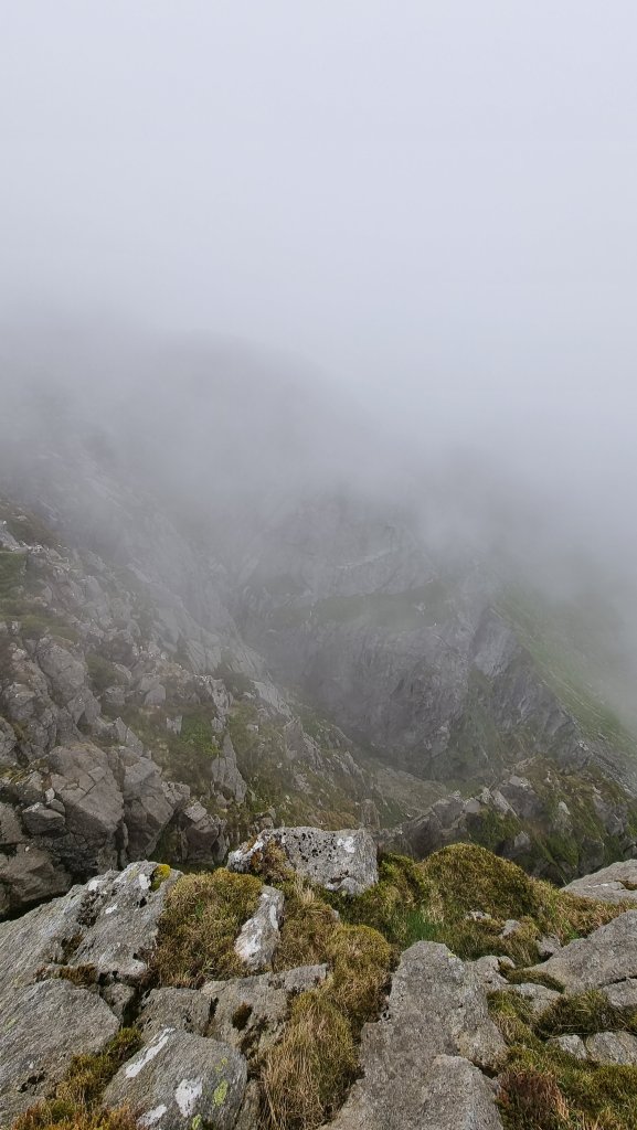 From here, you head left up the ridge towards the summit of Bwlch Eryl Farchog and soon arrive at the top of the buttress route and a view over the abyss of the Amphitheatre down to your chosen crag – a sweaty hour and a quarter. The views of Mur y Niwl and Pinnacle Wall above it are impressive and it’s worth spending a bit of time here to pick out the lines of interest and especially to spot the most useful abseil lines – or would be if the whole thing wasn’t buried in cloud!