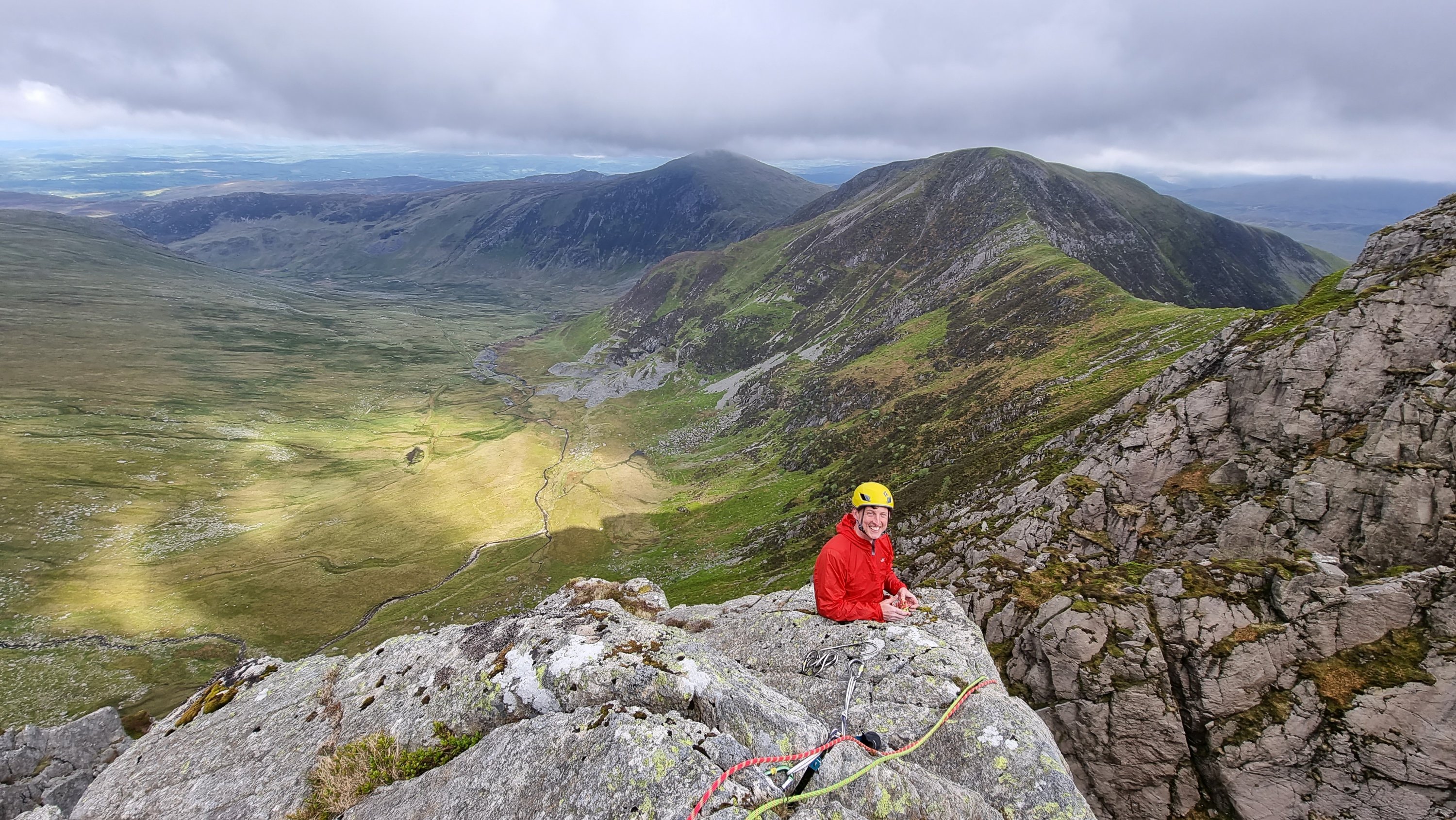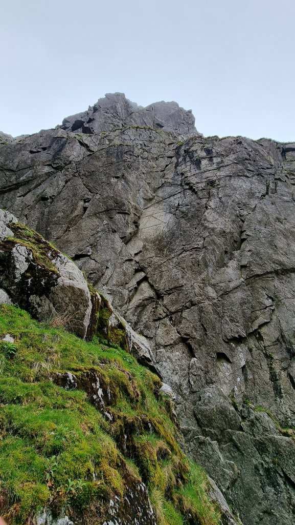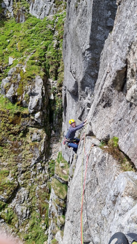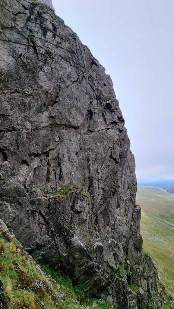 You might be surprised by the mention of abseiling, but this is the trick to a productive and pleasant day hereabouts. A 45m rap from the obvious spike at the top of the wall gives access to the commodious Bilberry Ledge, and another of 50m (from spiky flakes halfway along the ledge) lands you pretty much at the start of the routes Mur y Niwl and Aura. (there’s a rap station with fixed tat and a crab at the far left / gully side of the ledge, but this leaves you with a bit of a damp scramble at the end.)