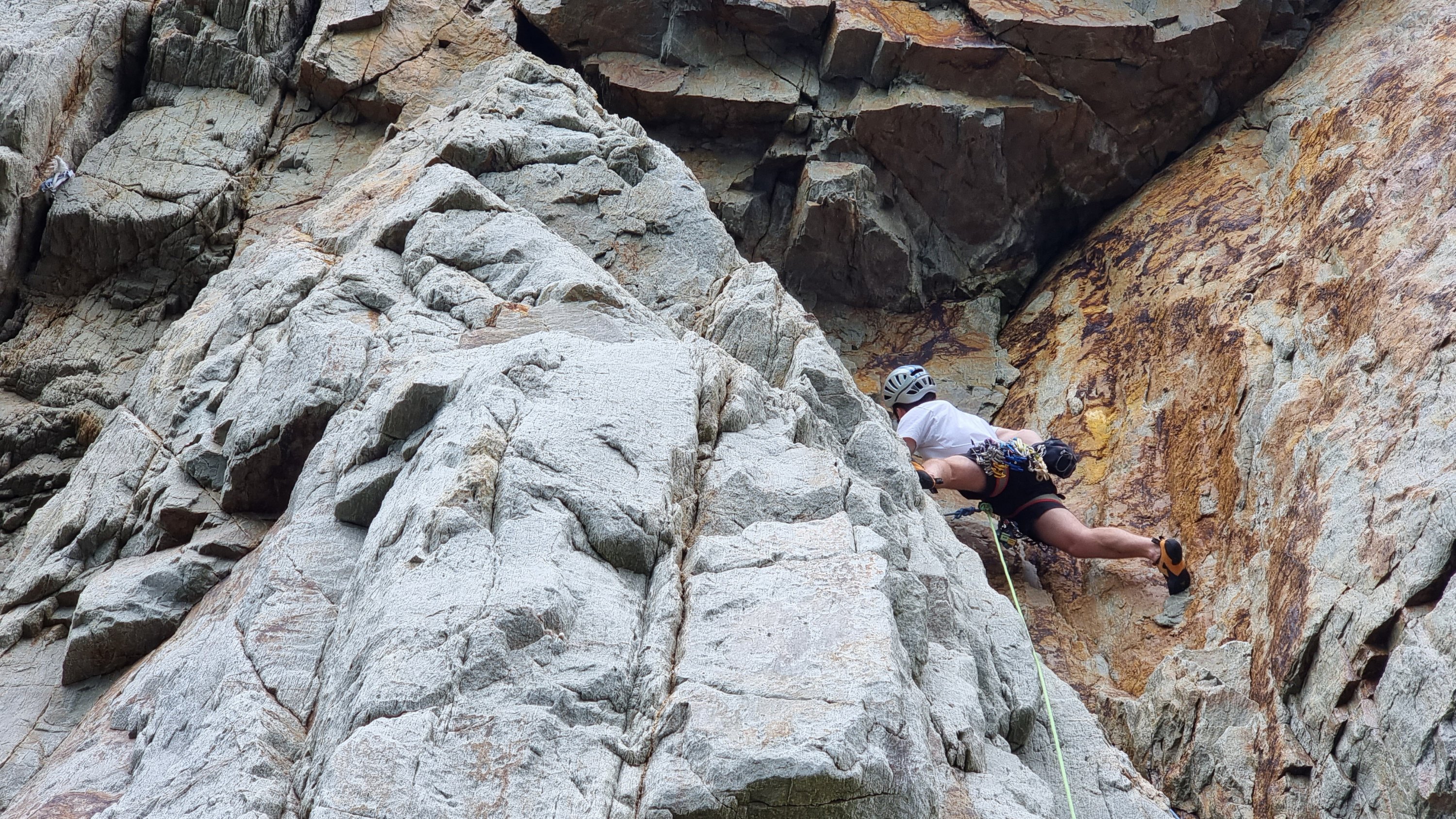 A bit of A1 shenanigans (El Cap experience coming into play) had me marvelling at Jake’s tenacity but by the time I made it to the stance the heavens had opened and the Main Cliff pitch 2 curse had struck again. Rapping off a handy spike, and twirling to the ledge below, it was obvious things had got pretty wet out of the shelter of the unrelenting steepness above. After a bit of a conflab with Adam and Will, who’d also been hoping to do Mammoth, we set off back across the traverse in search of dry rock or at least a less ambitious objective.