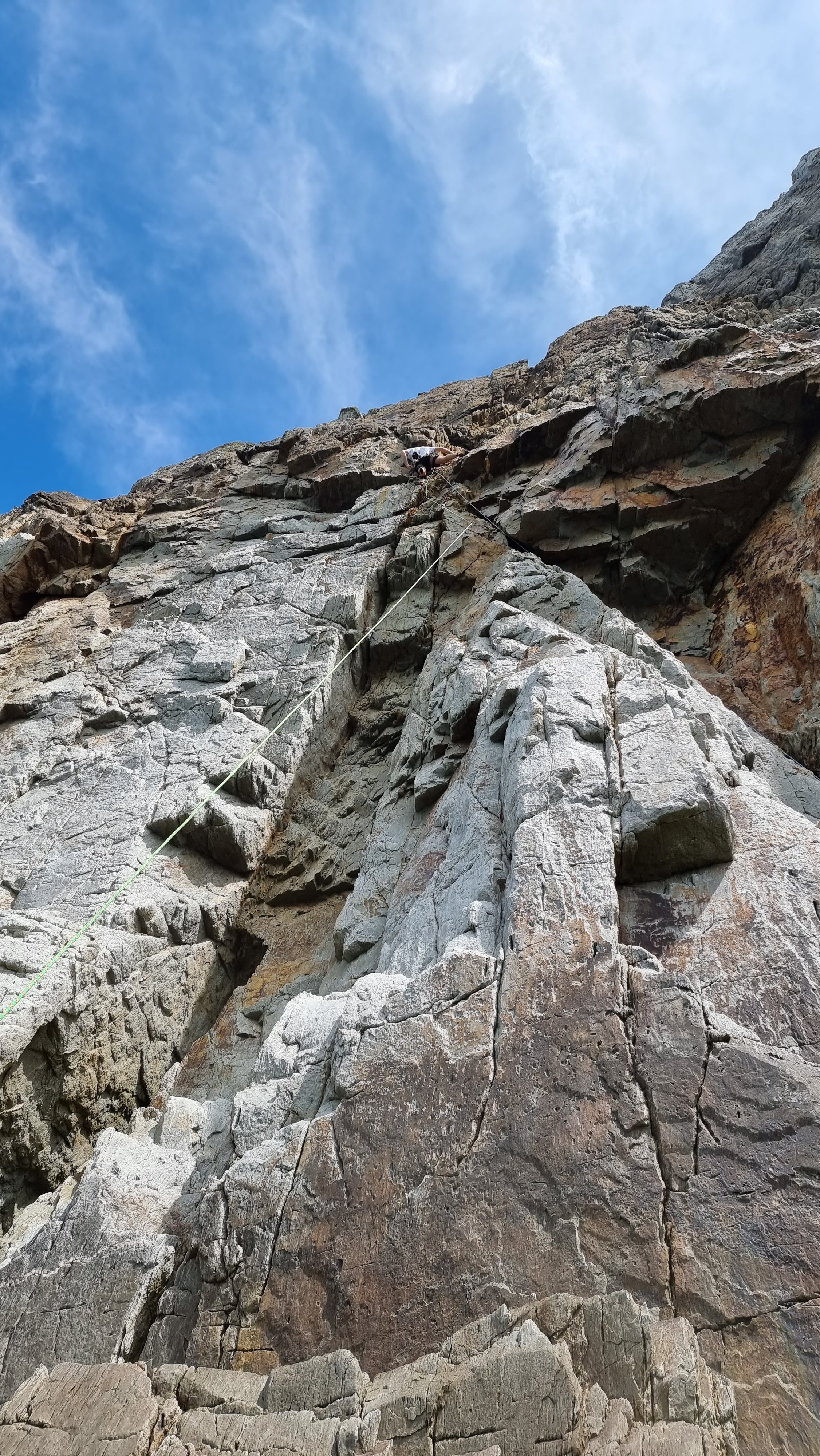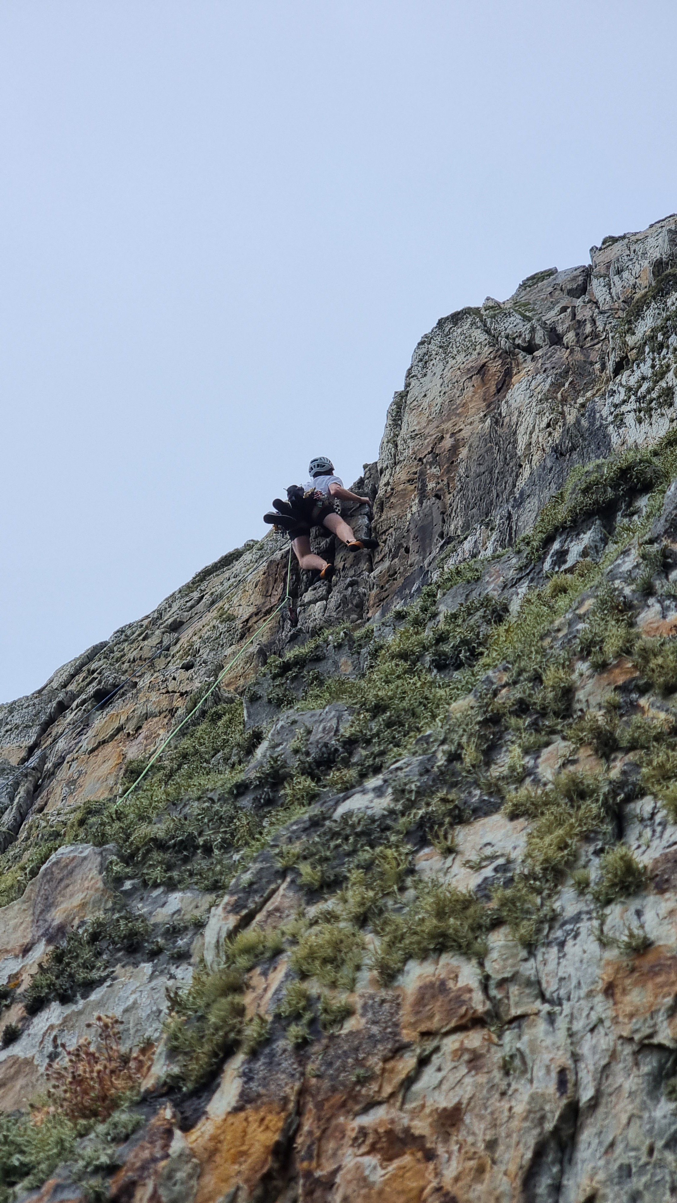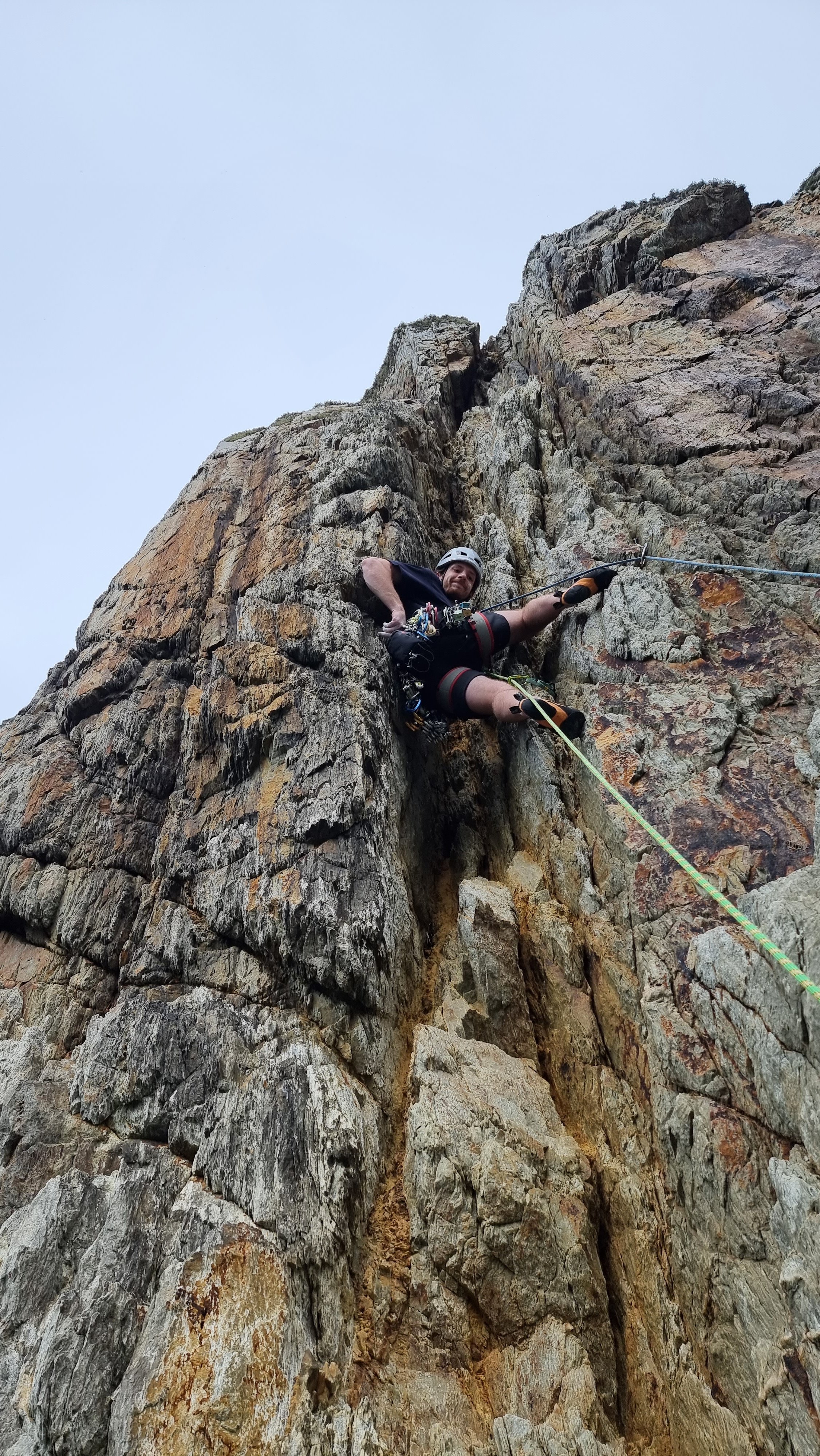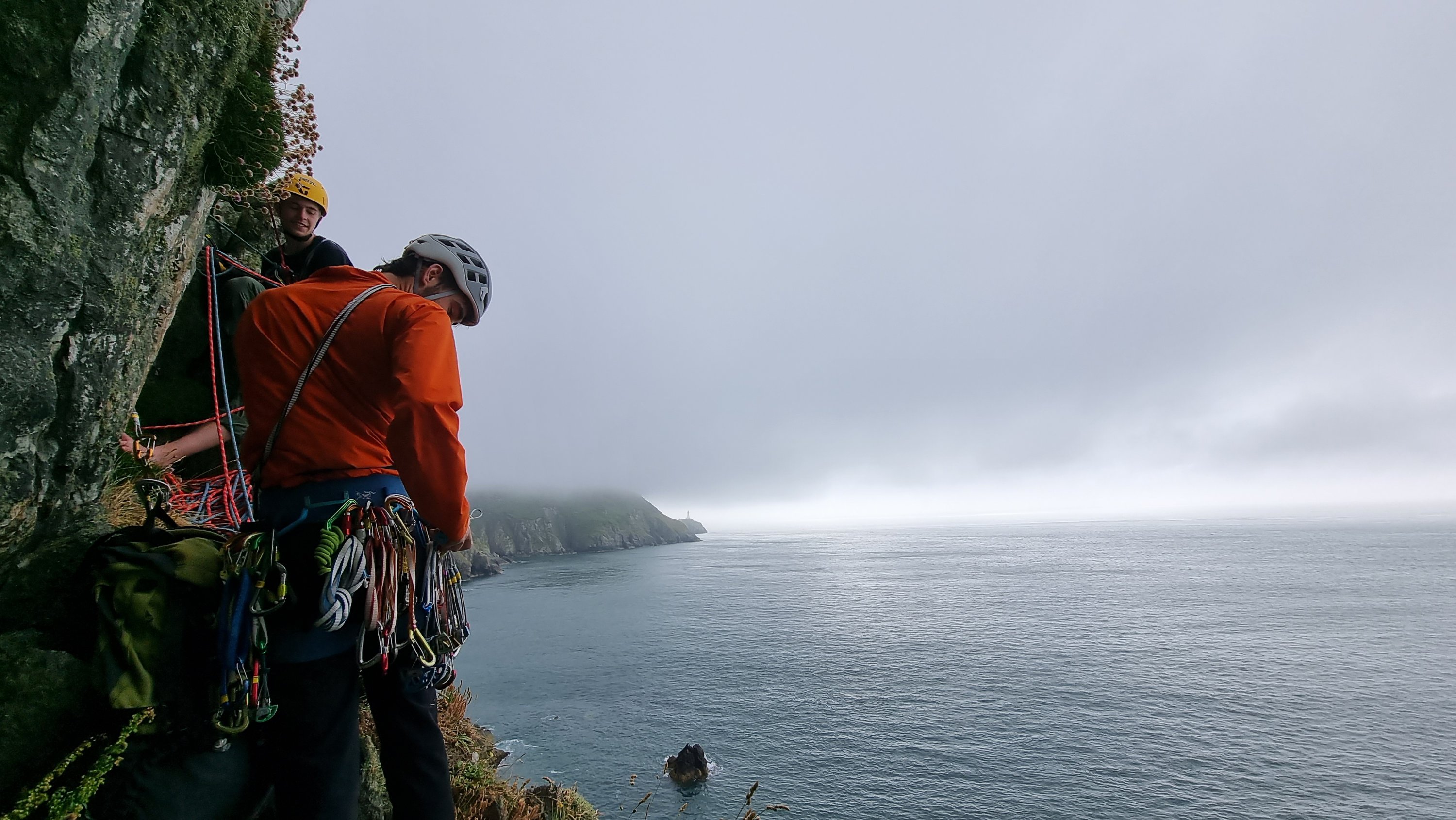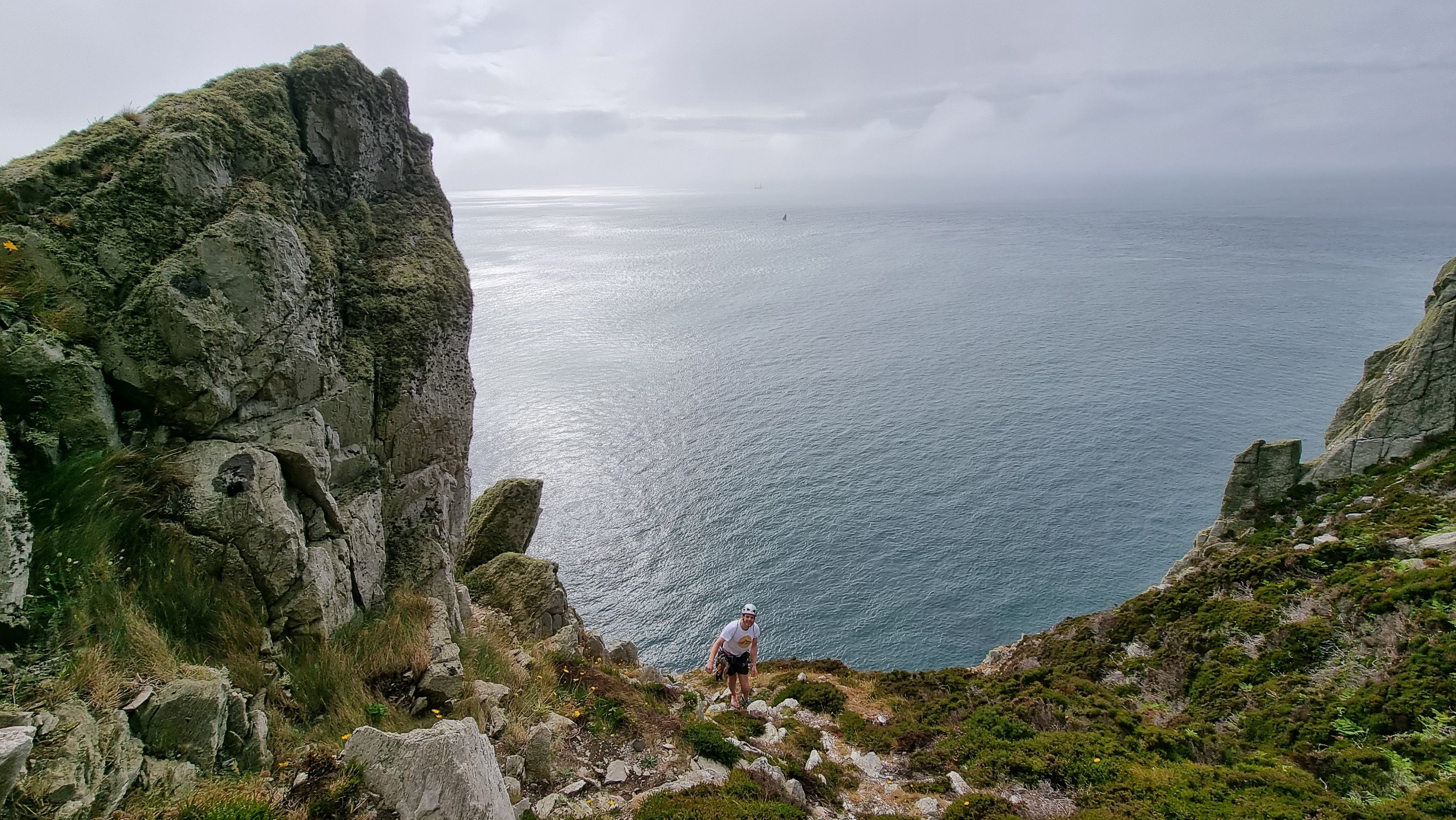 Passing the Gogarth Pinnacle in a lull in the rain, it didn’t look too wet, so Jake and I decided to “take a look” rather than opt for the ignominious retreat up the descent gully. I strung together the first three pitches, with the 5b P2 proving damp but doable, with the “easy” P3 a mildly terrifying voyage up soaking lichen. Atmospheric views out to sea shared with a team on Resolution Direct