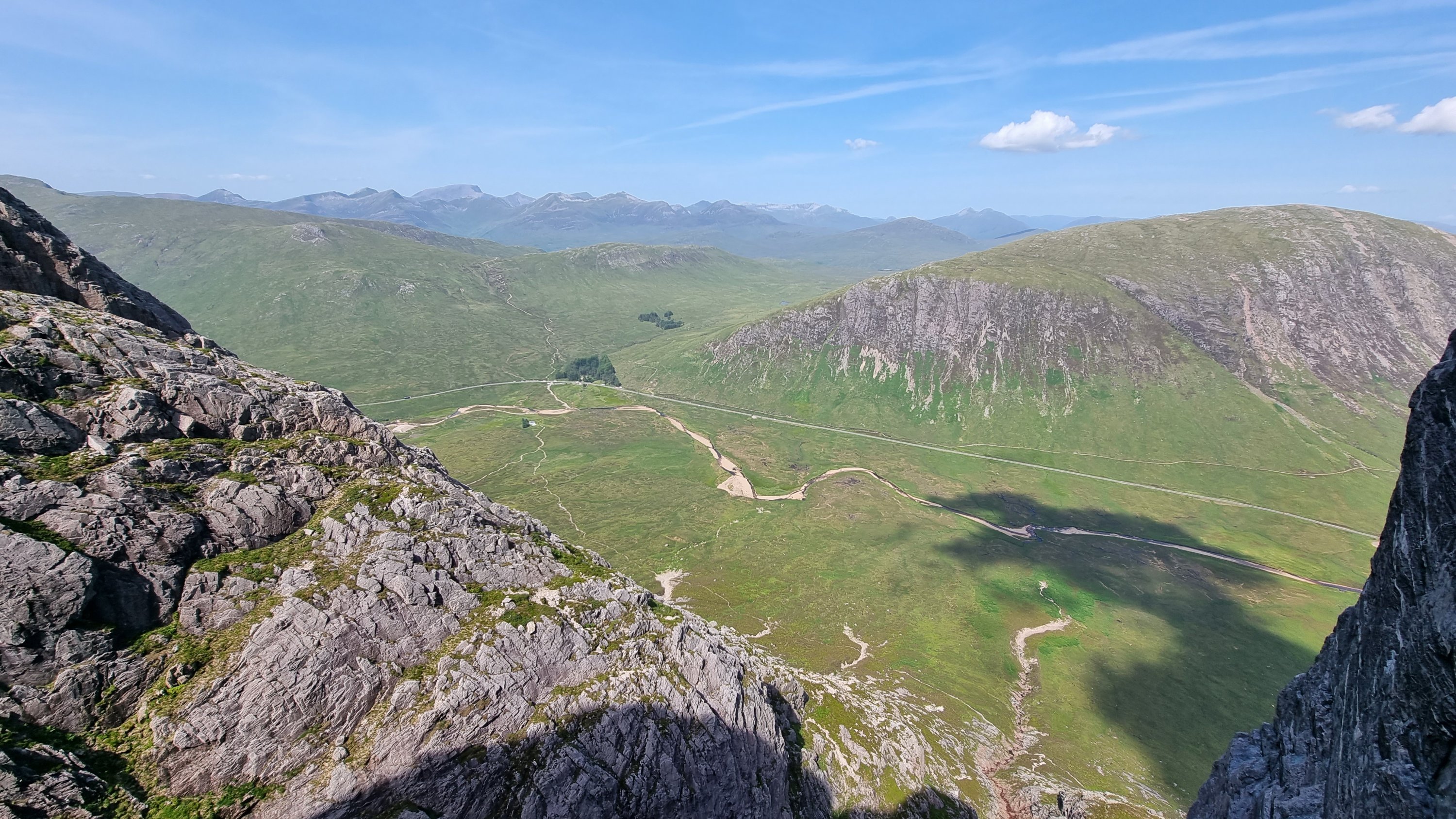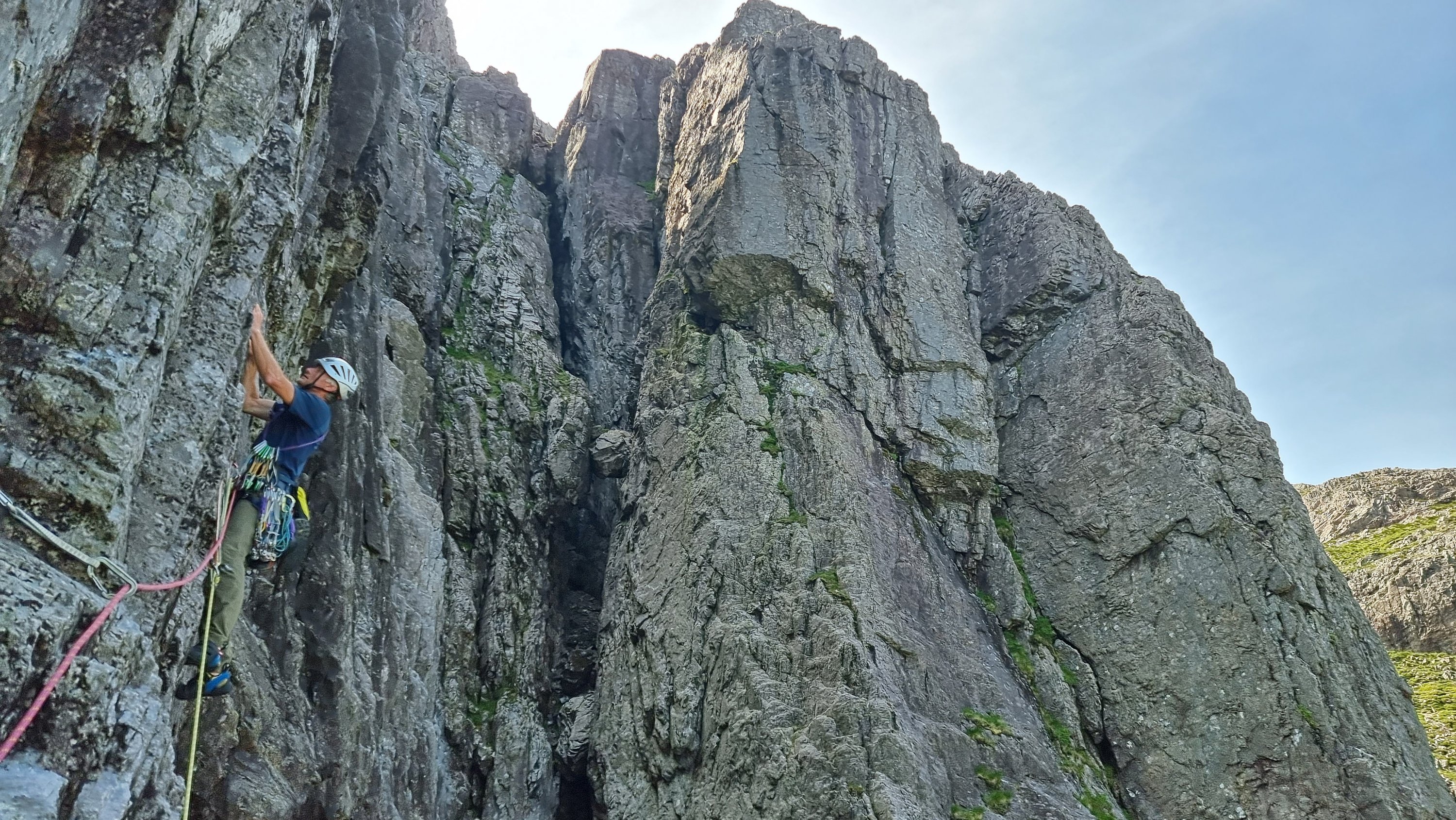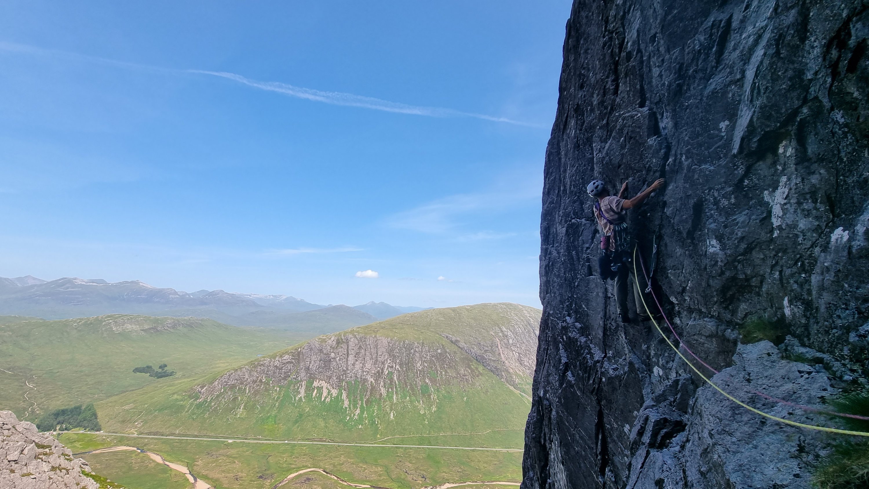 The unappealingly named Slime Wall on the Buachaille is actually a fabulous chunk of rock, set on the shady north wall of Great Gully, but as you’d imagine, it needs a dry spell to be in nick. Perfect spot for a Glencoe heatwave, and “only” an hour from the road (bliss after a two hour flog up and down for each of the previous three days).