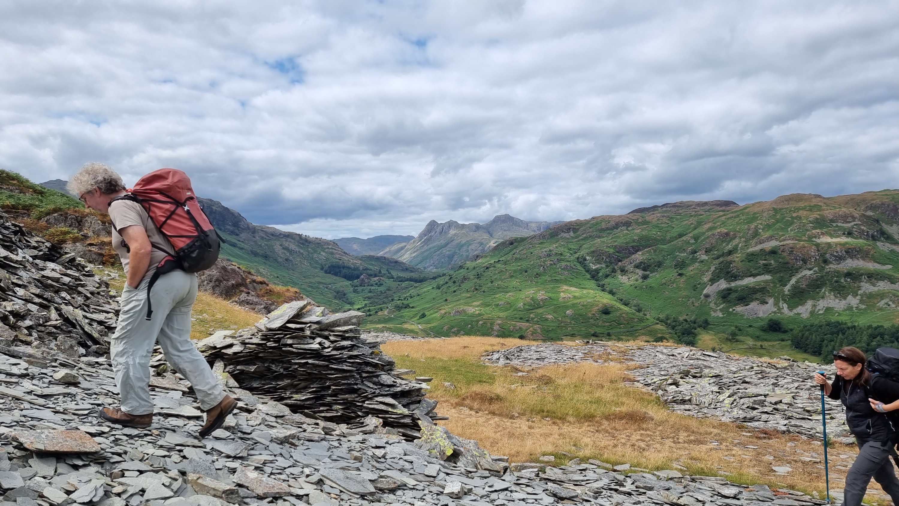 Then lead the way up to the middle quarry, past great views over the Langdale Pikes.
