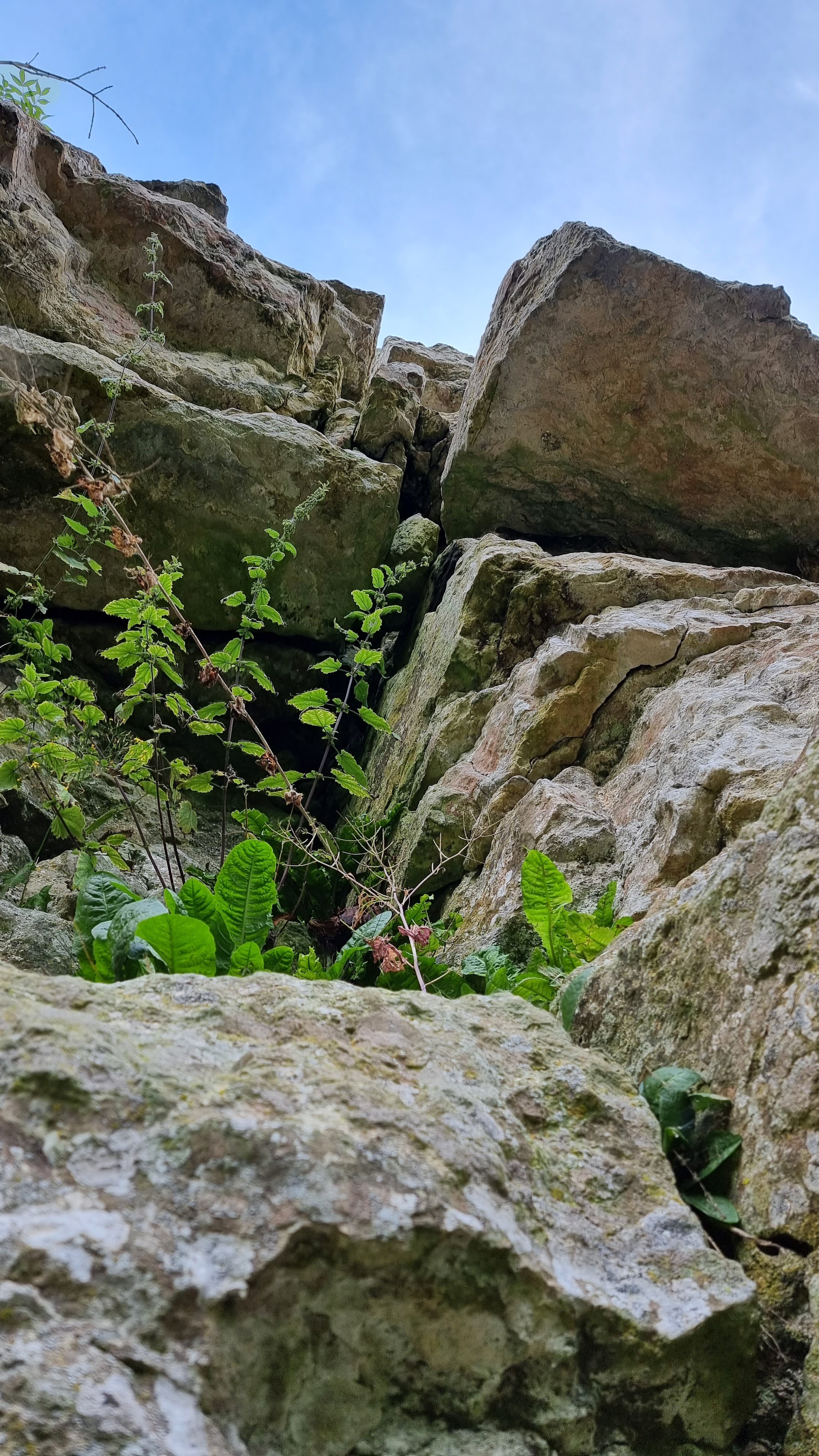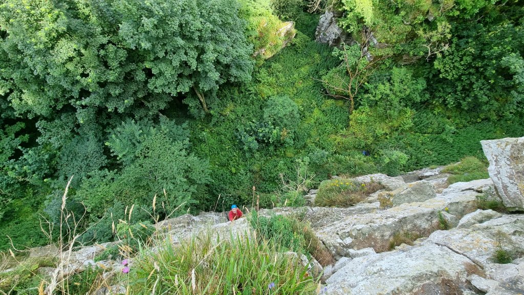 Giant Jenga blocks seemingly held together by a gloopy paste in defiance of gravity. As I pulled gingerly on a jammed microwave-sized chockstone leading through the first roof I found myself cursing my single-minded focus on a random list in a 30 year old book. As height was gained, the buttery texture of some of the lower holds gave way to dryer rock as I left the moist dell below me.