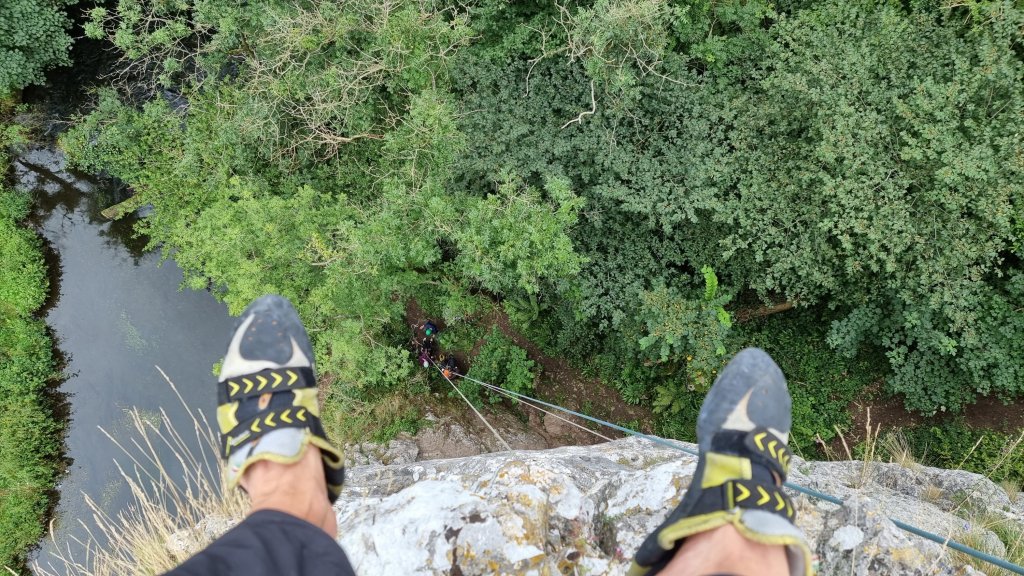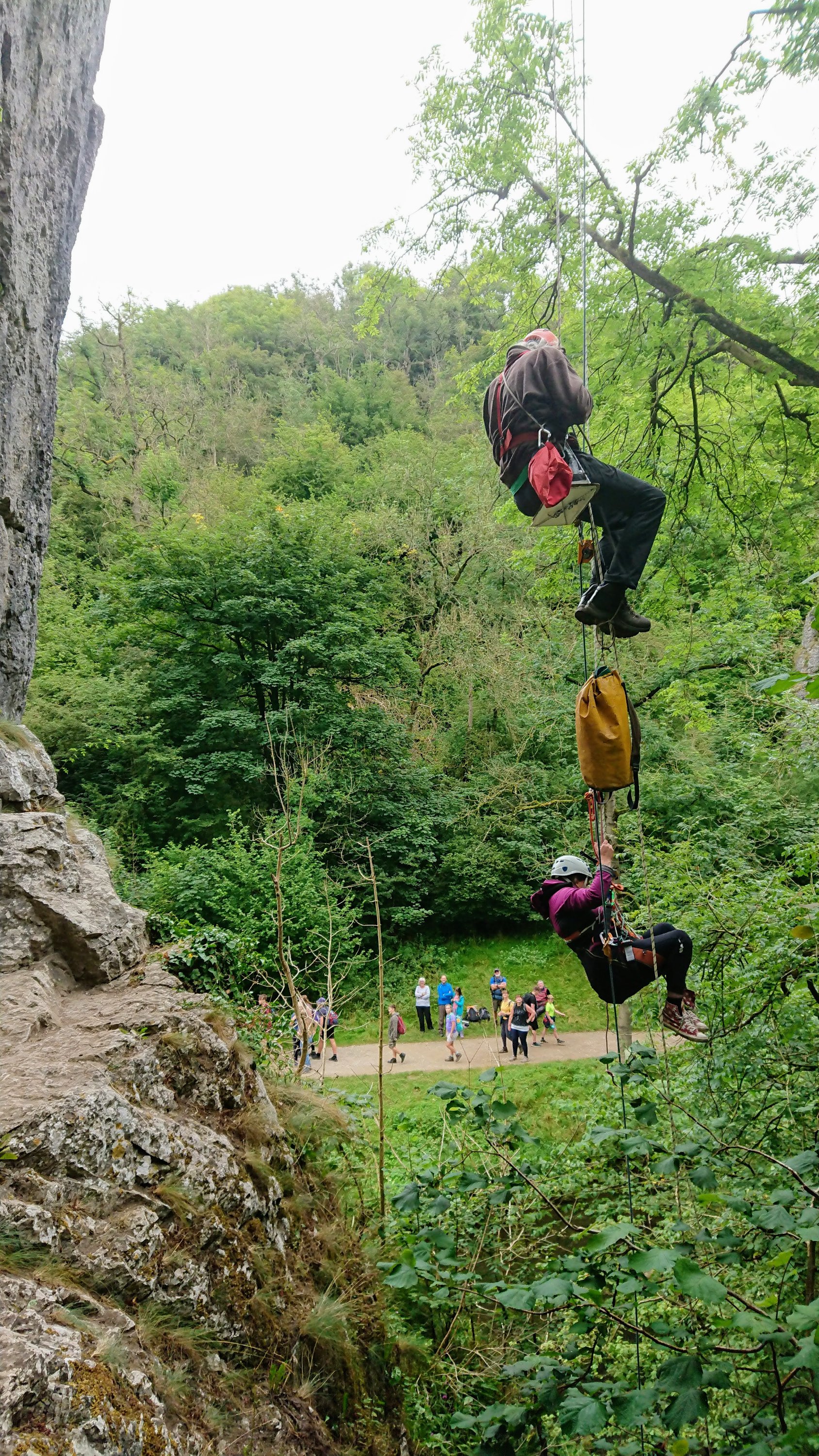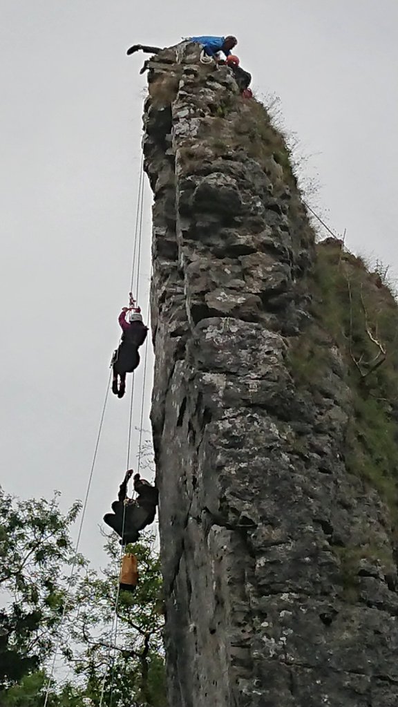 It might look like a cluster#u@#, but most of the bits of string and gear in the set up below were necessary to tie together the crumbling top of Dovedale’s iconic pinnacle and provide back-up redundancy against all eventualities.