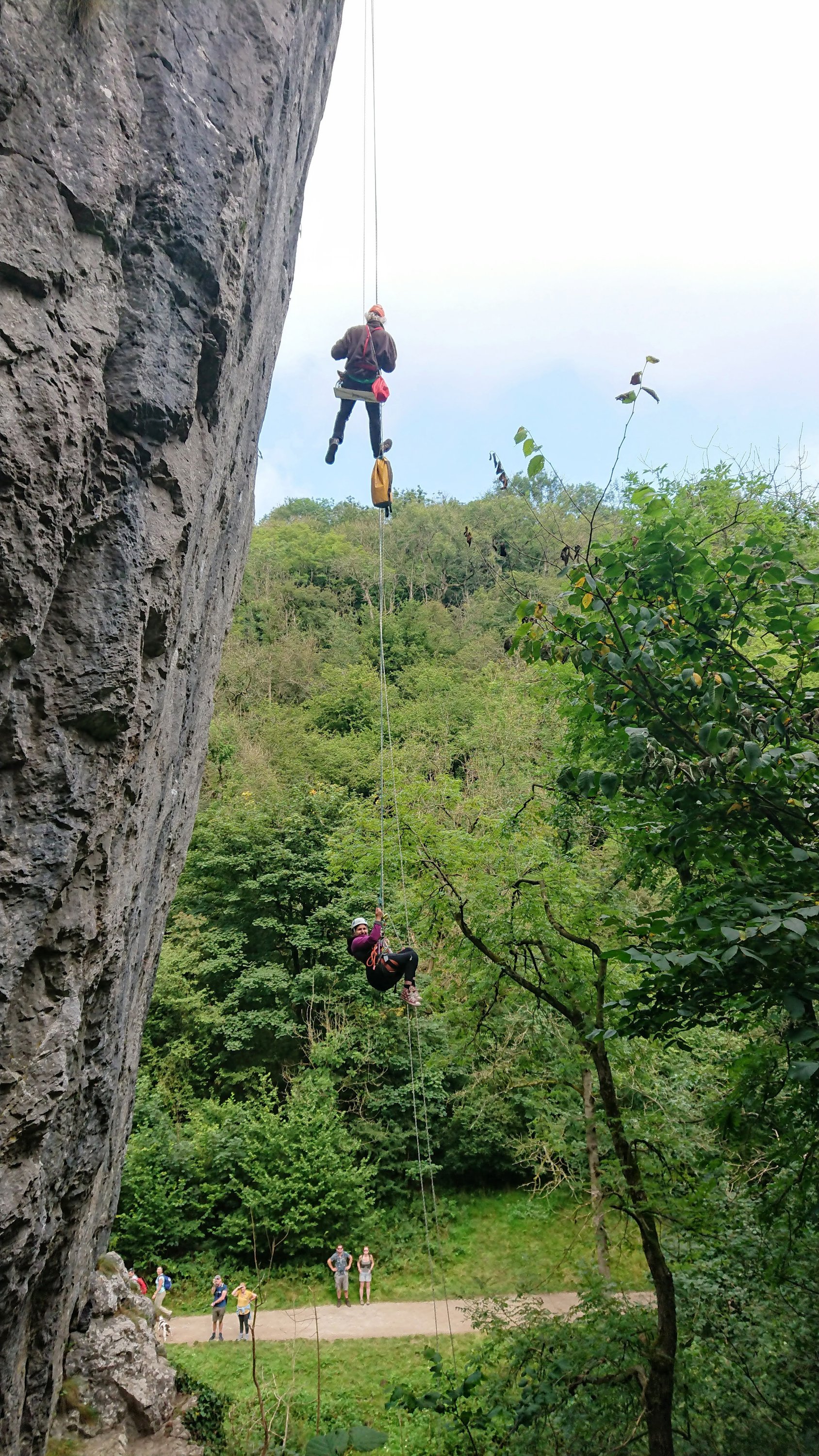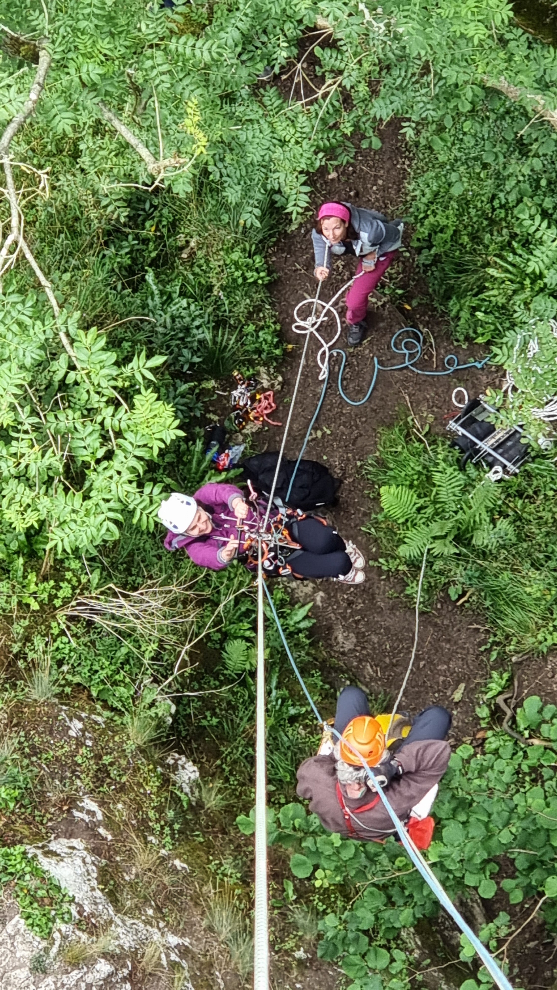 The team assembled at Milldale a couple of weeks later, with Bill and me forming the advanced party to get a rope up, Dave accompanying Michelle in jumaring up a parallel rope, Andy in charge of ground-ops and Helen and Jane providing moral support.