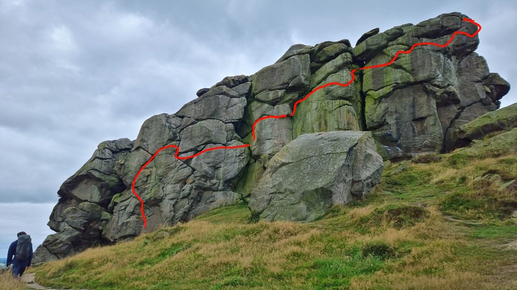 It’s quite a voyage, as you’d expect from a 200ft route on a 50ft crag. Here’s a rough line…