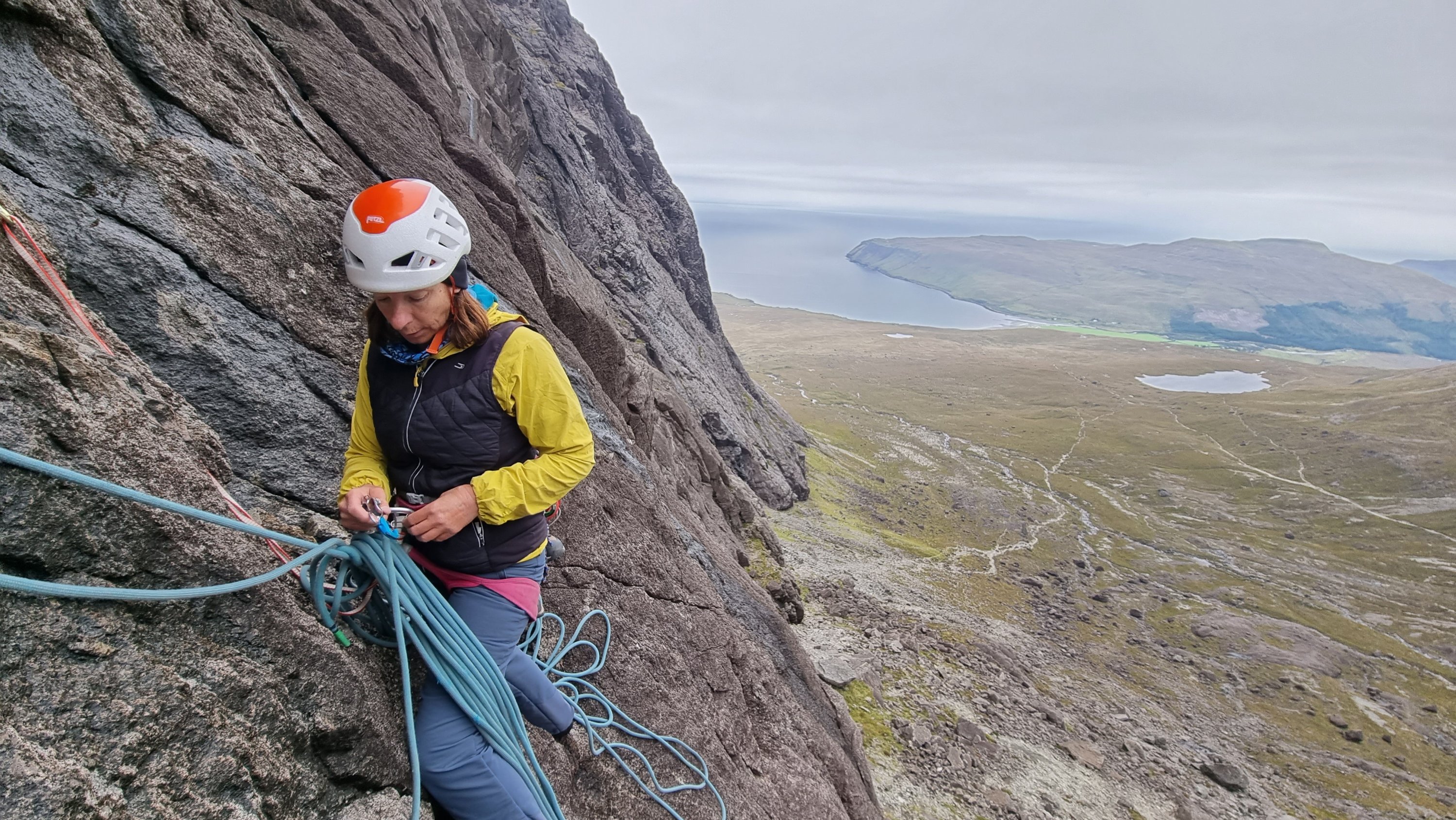 This brought us to The Terrace, and the easy decision to take a left and head down before the weather closed in completely, rather than right for further exploration of the Cioch and its eponymous slab (you can see a team descending from the neck of the Cioch in the photo below.