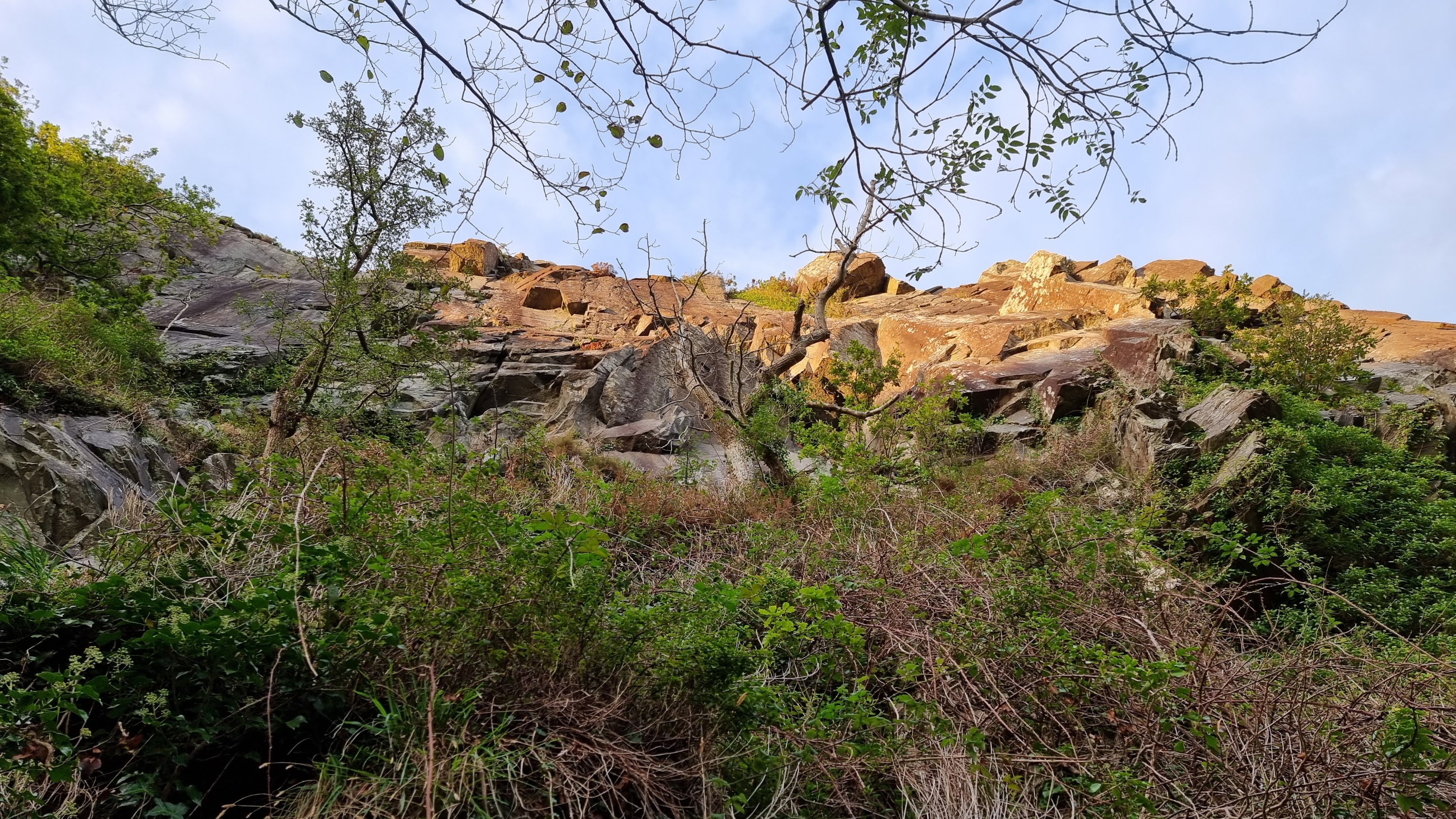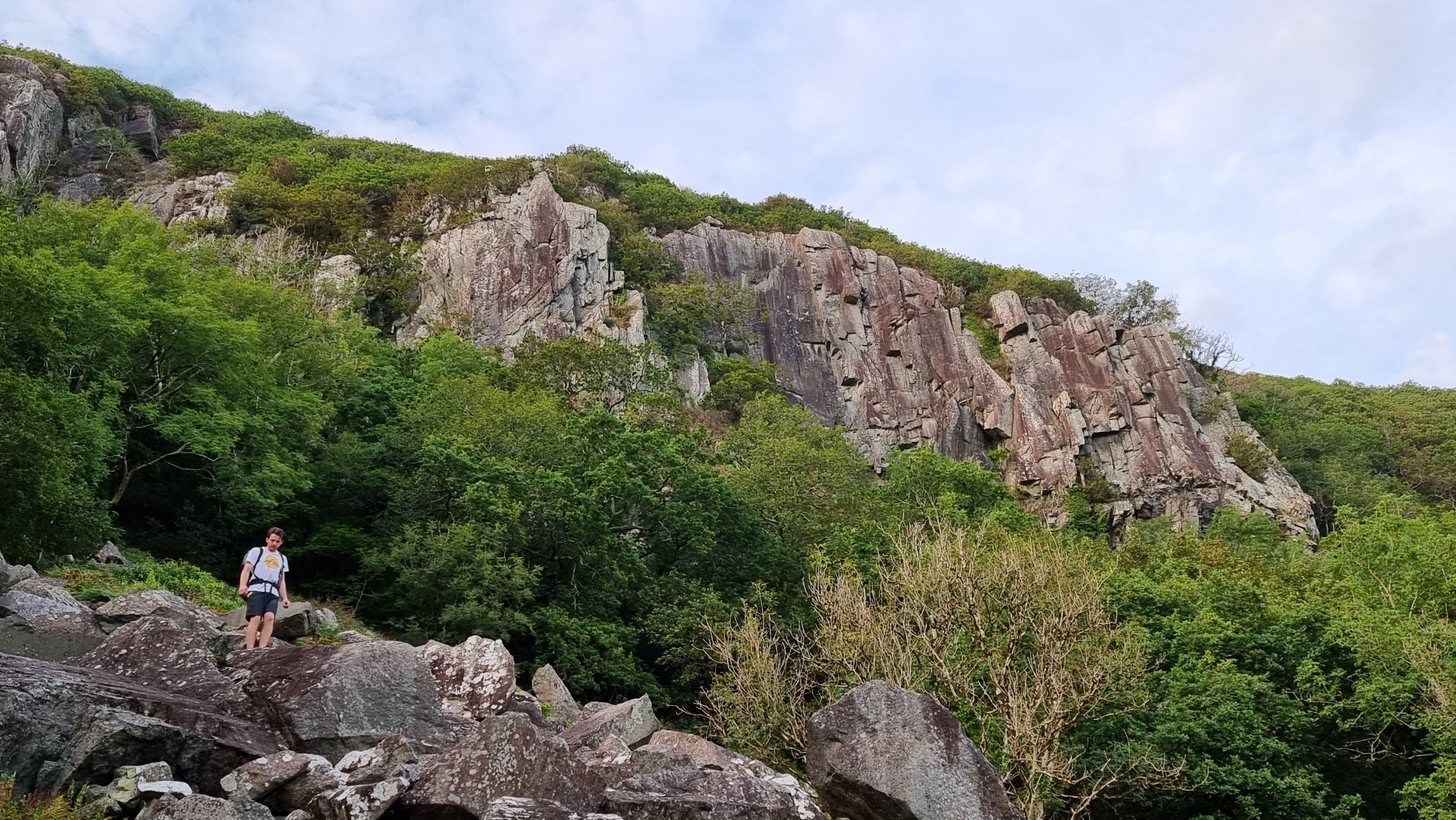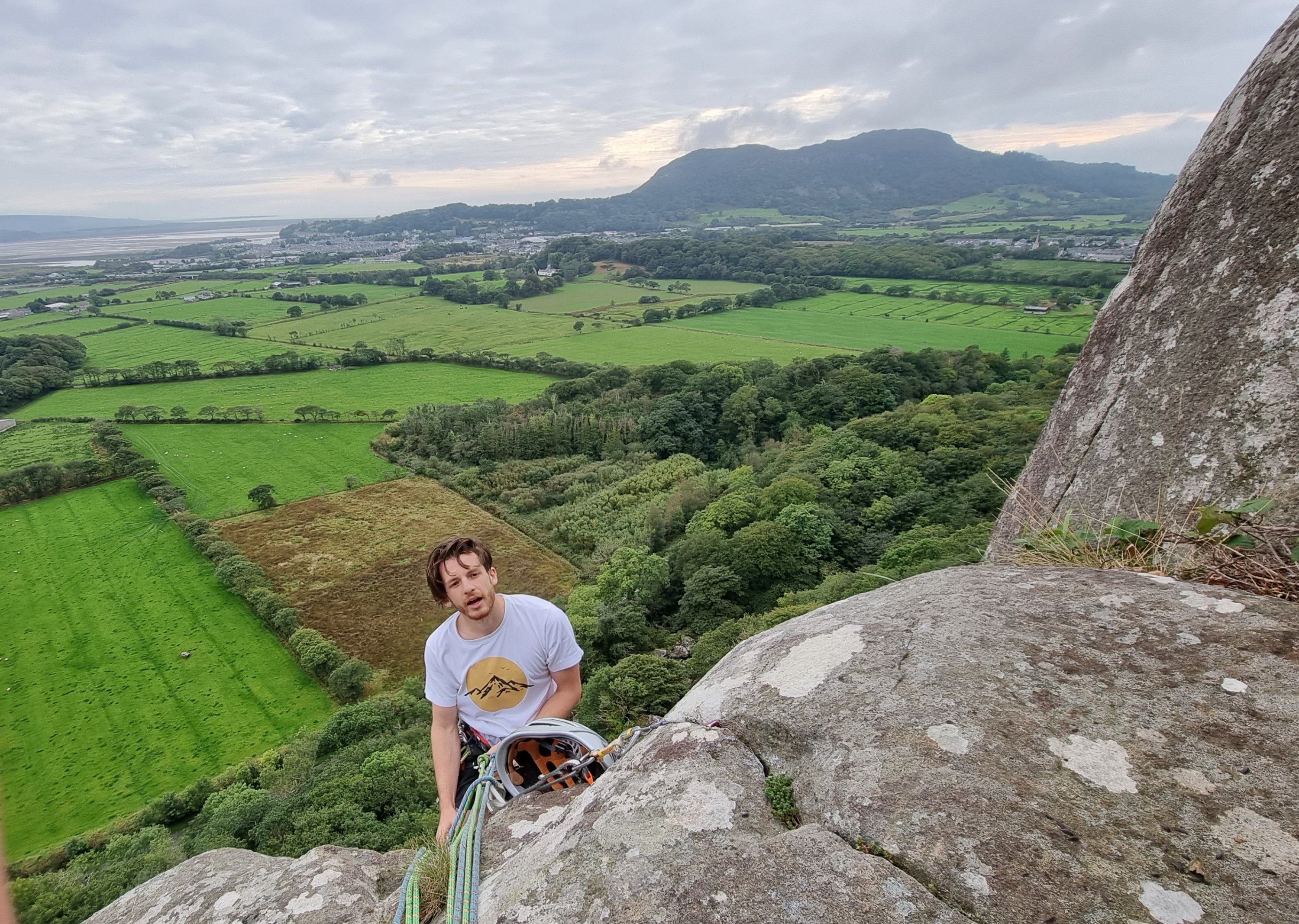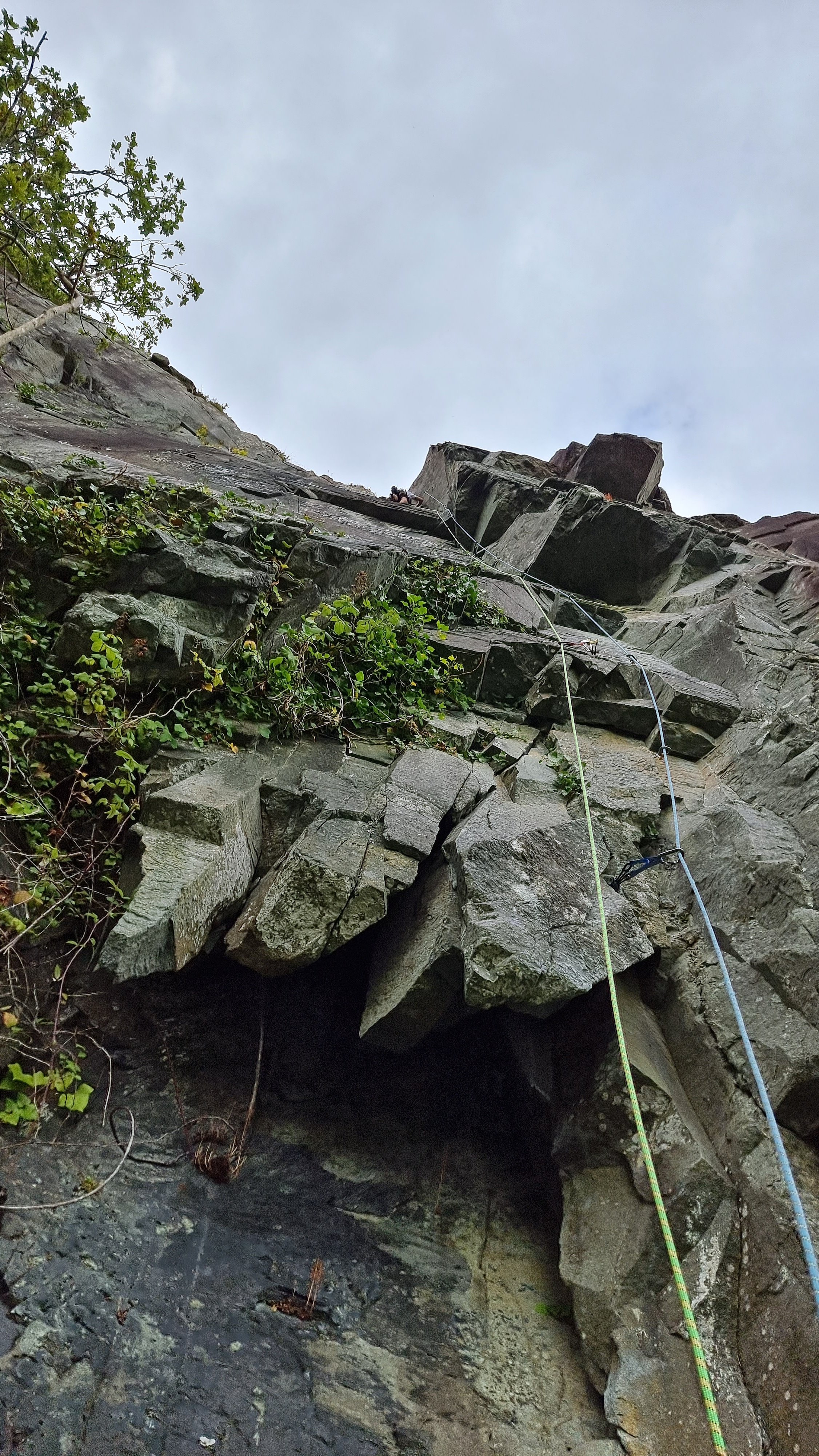 A gloomy forecast across the UK, with occasional chinks of dryness had Jake and me heading for North Wales in hope rather than expectation. Even the usual safe bet of Gogarth was looking dodgy, so after a final scan of the weather apps we set a course for Tremadog. Arriving around 2ish, we’d just missed a major downpour, but Vector Buttress seemed to have been sheltered from the worst of it. There was no option to dither over a brew at “Eric’s” as it was closed for the season (and of course, sadly, it’s no longer Eric’s anyway. In more “things ain’t what they used to be” news, the campsite has now vanished under an infestation of Glamping Pods – oh dear!)
