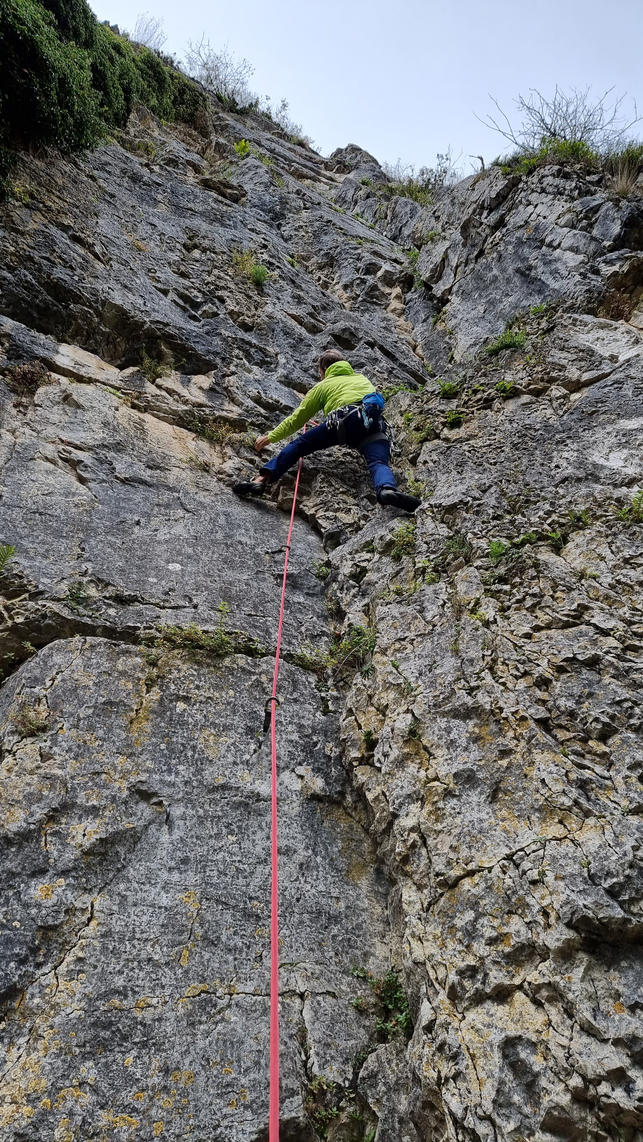 Route of the day, for me, was Bob et les Ferrailleurs, a 6b+/c running the full height of the crag with a desperate sting in the tail.