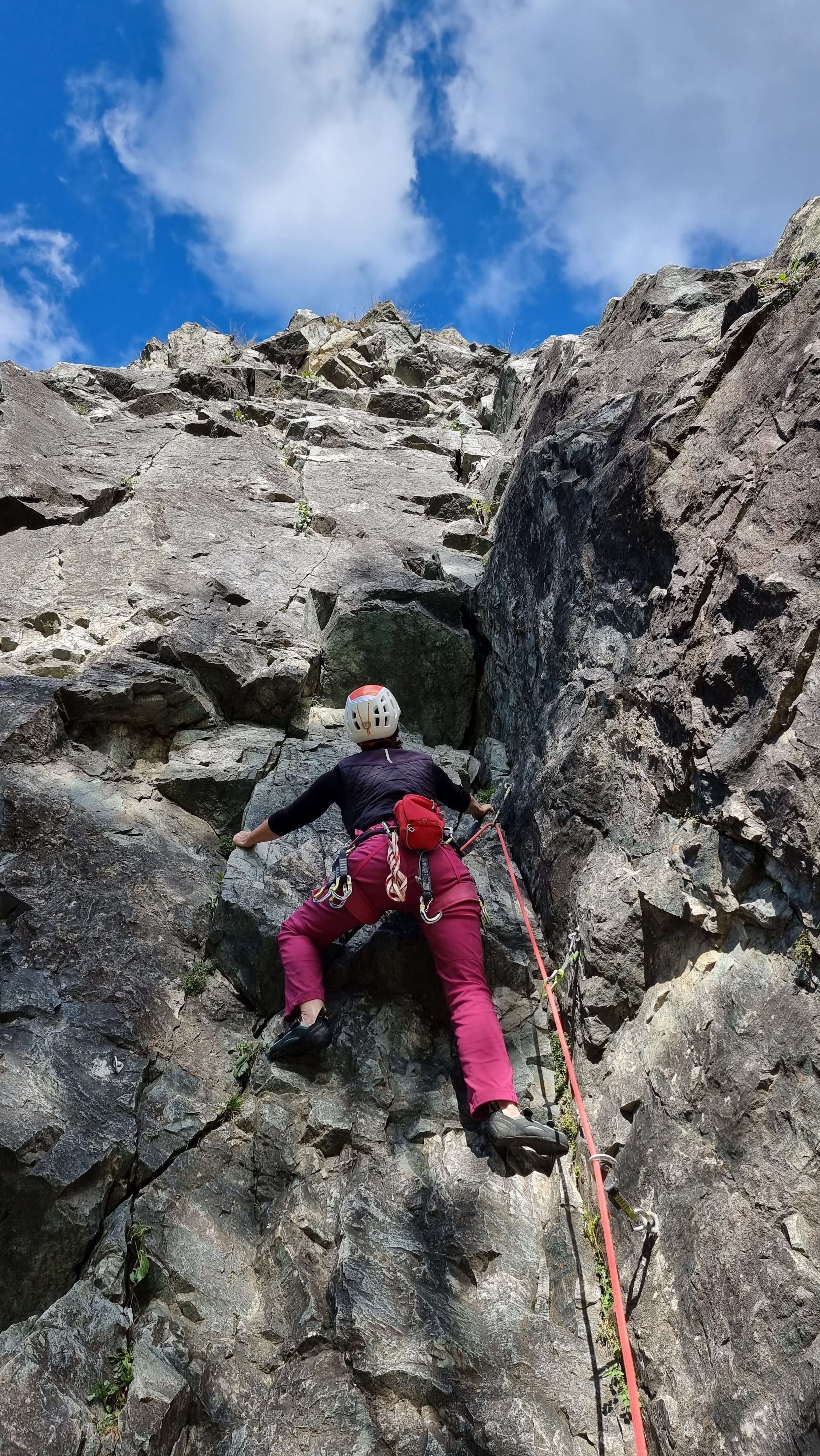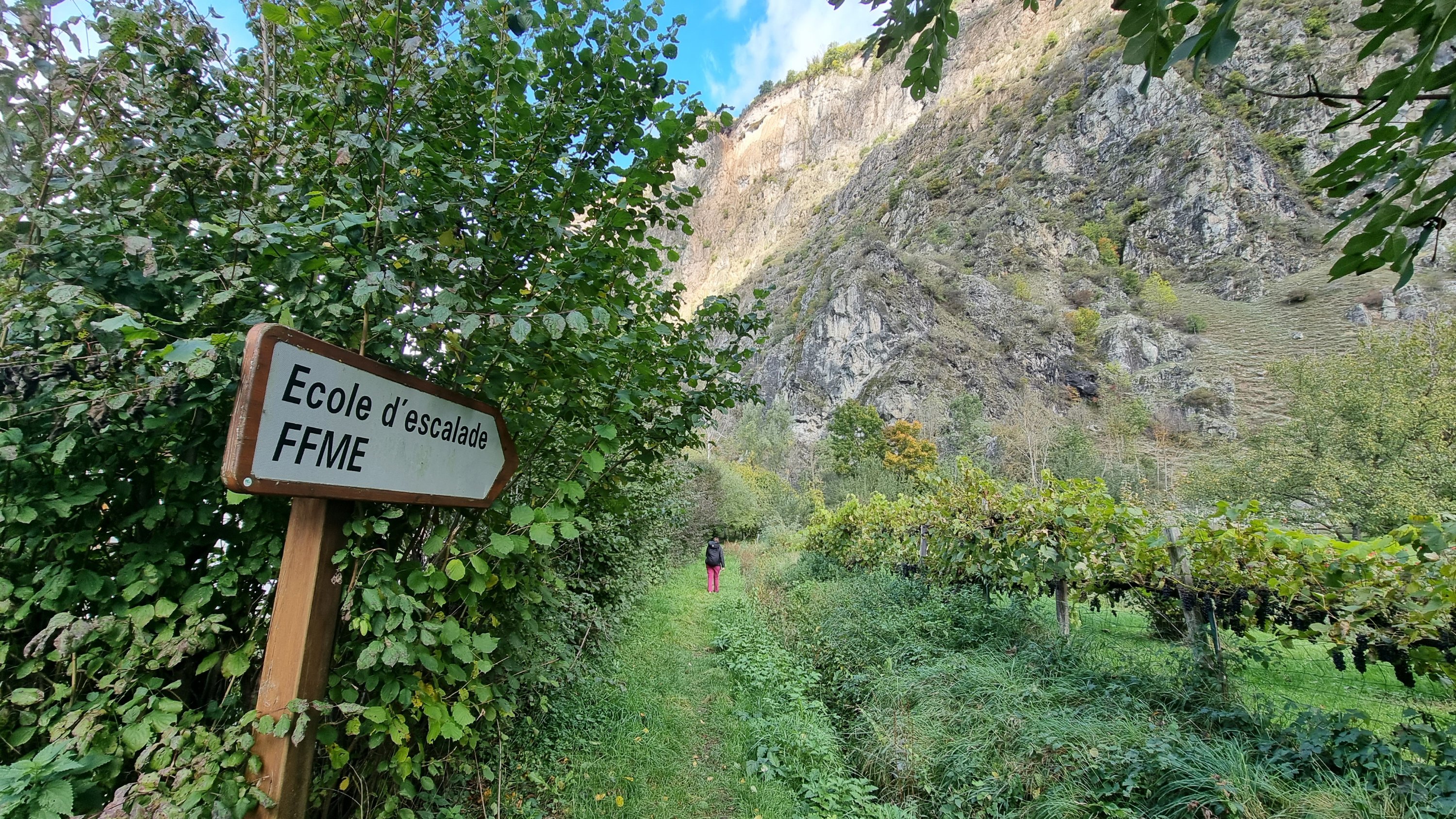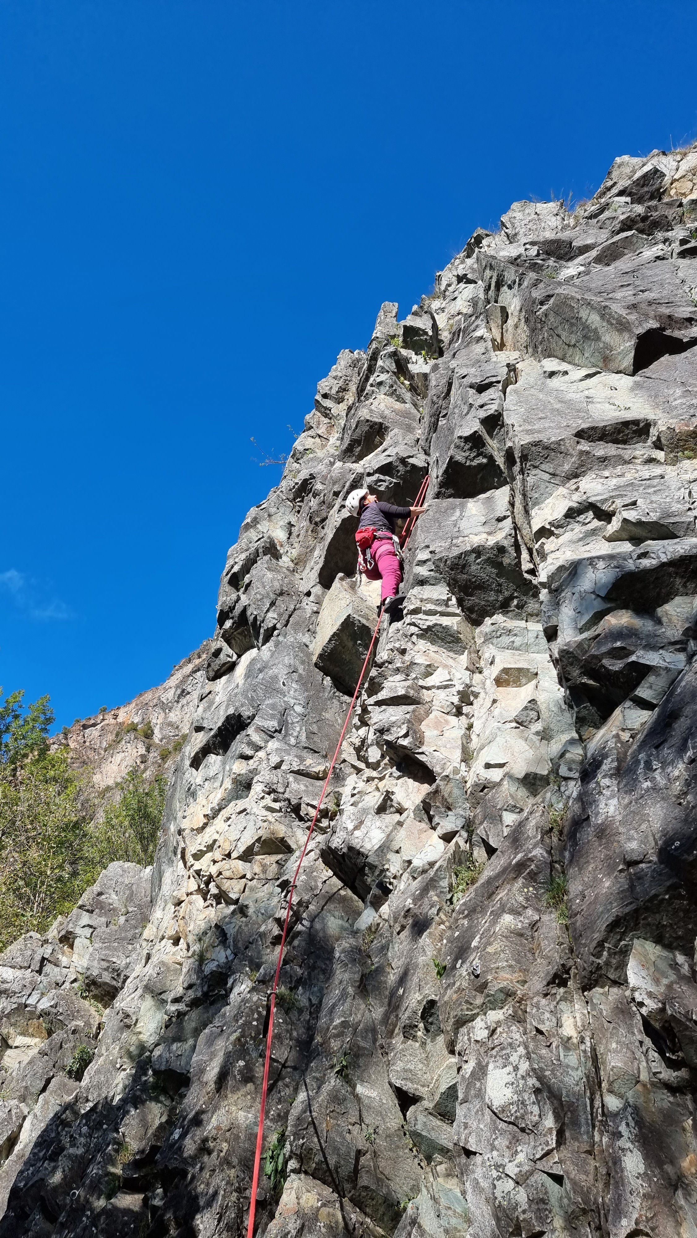 Another rainy stopover near Grenoble, with more precipitation forecasted, and we resigned ourselves to a day’s driving, but things perked up as we approached The Oisans. Leaving Bourg d’Oisans on the road to Briancon (which ultimately crosses Col du Lautaret for you cycling buffs) we were intrigued by a carved wooden sign: “Escalade” and pulled a few hundred metres down a narrow gravel road. Sure enough, we’d stumbled across Le Vernis, a modest but very handy Gneiss (and quite nice) crag. Definitely not “Destination” quality, but the sun was shining by now and it was feeling pleasantly warm despite the altitude. The “stick or twist” debate was short-lived as Helen pointed out the advantages of a bird in the hand (or perhaps un Oiseaux dans L’Oisins).
