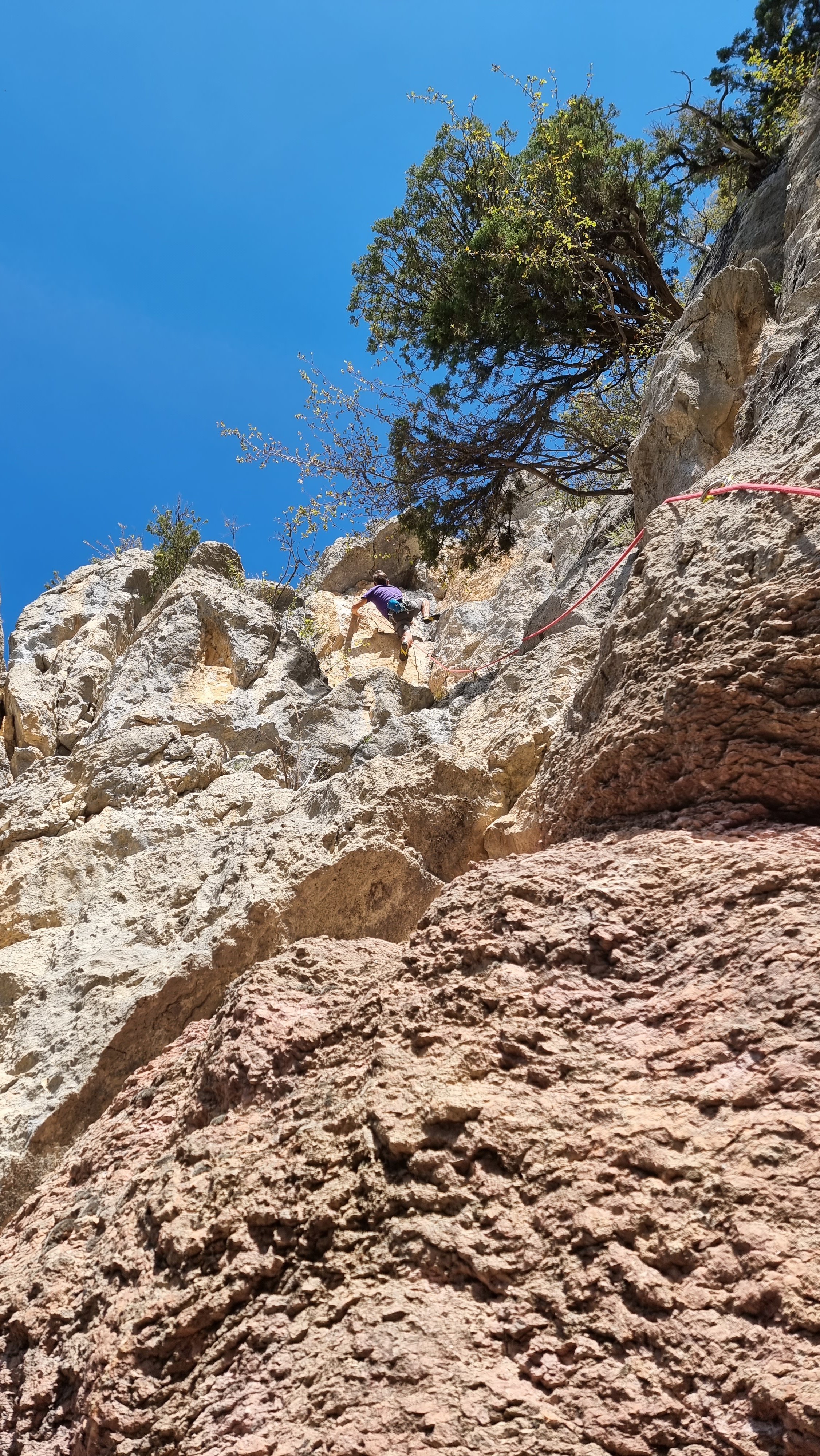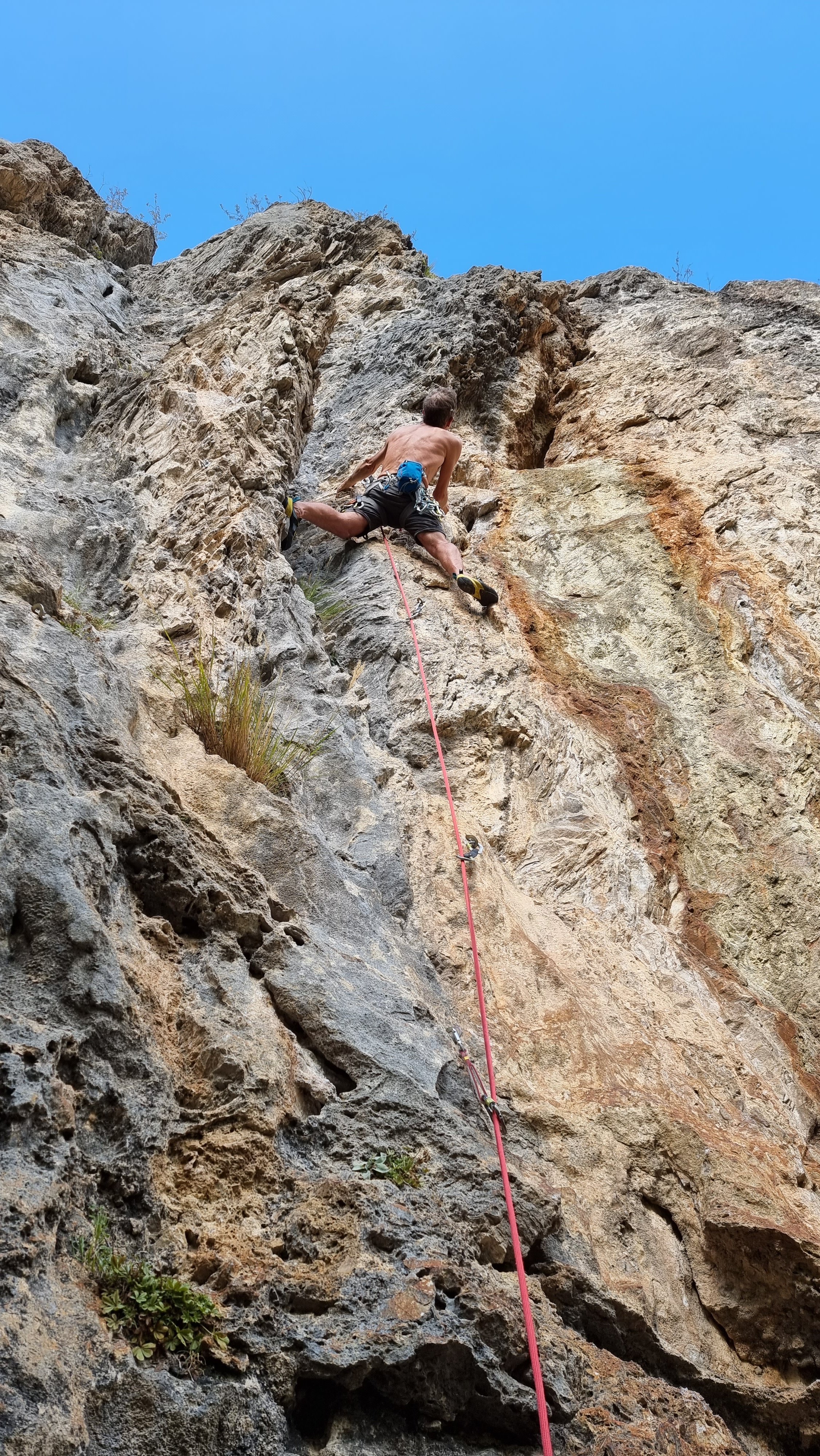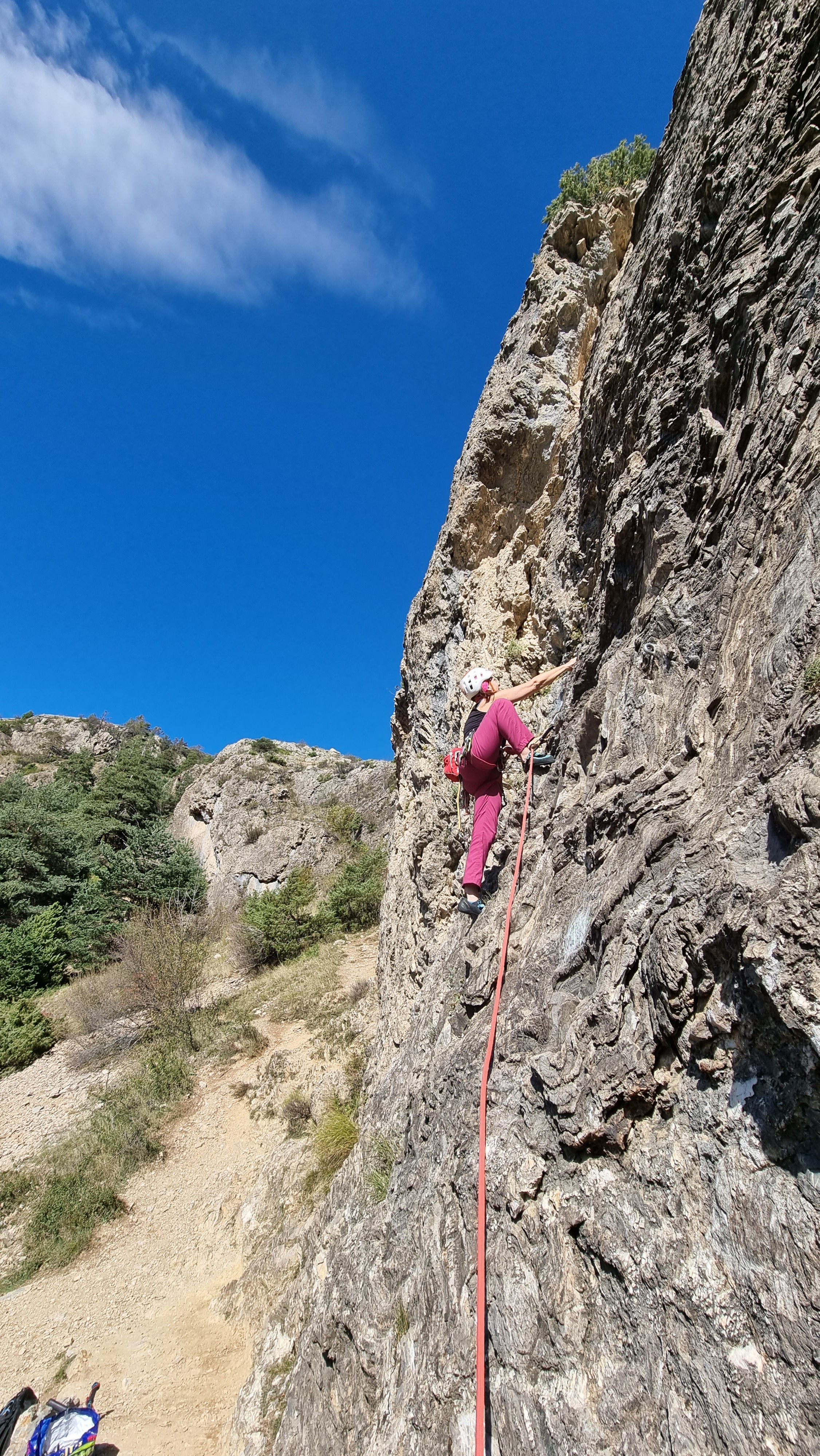 This leads up into a narrow gorge, via a good zigzag path, and up about 100m vertically to reach the crag. The 25mins approach in the guidebook is a bit optimistic but it’s a pleasant walk.