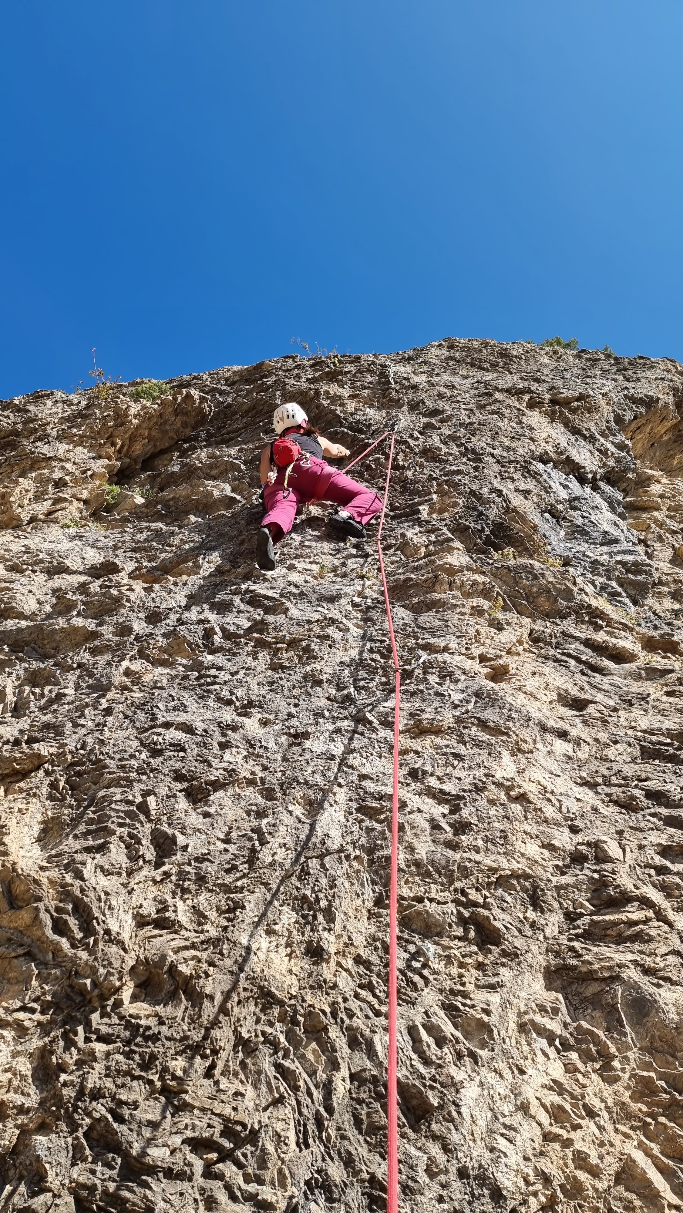 The guidebook promises of Bonne Adherence and Bien Equipment were both fully justified (and whilst I argue that “Too many bolts” is an oxymoron, you wouldn’t have wanted many more!) Thus encouraged, we did a few more routes in the middle of the crag, including Le Minimum, 6b+, La Derobe, 6b+
