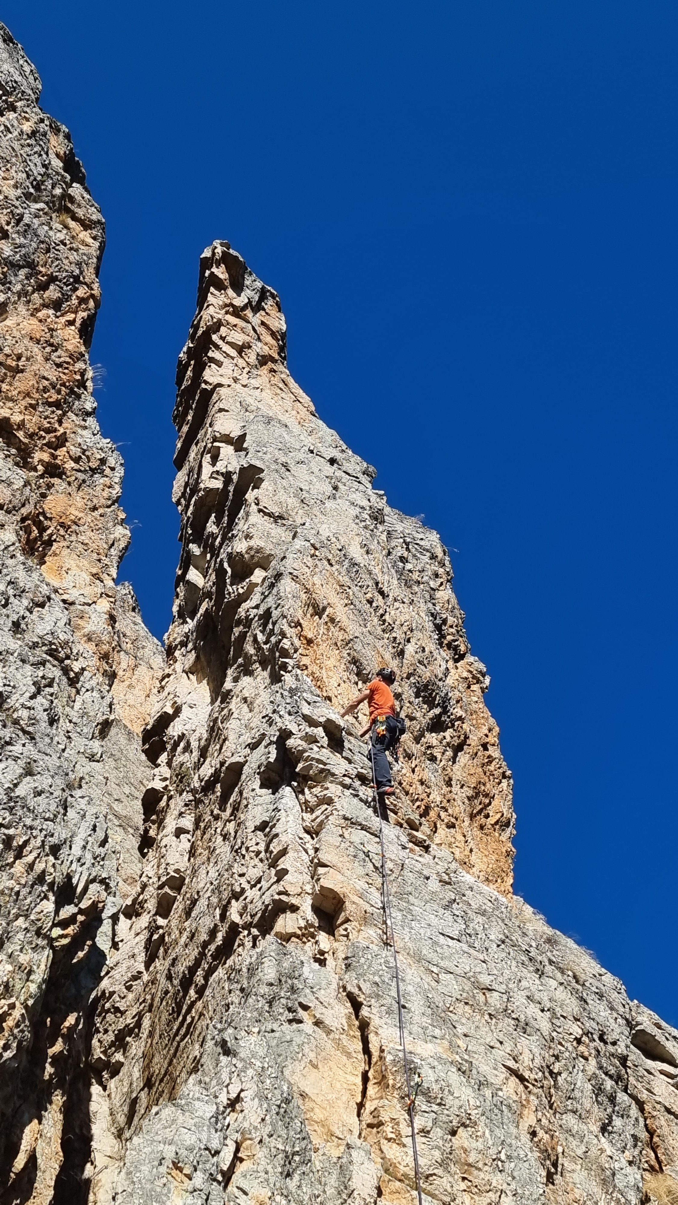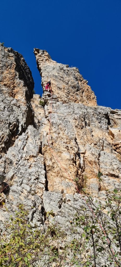 The right arete, Just un Spigolo, is a fun 6a, though doesn’t go the full height (here’s Helen nearing the crux and you can just about make out Albert at the top of the Voie Original):