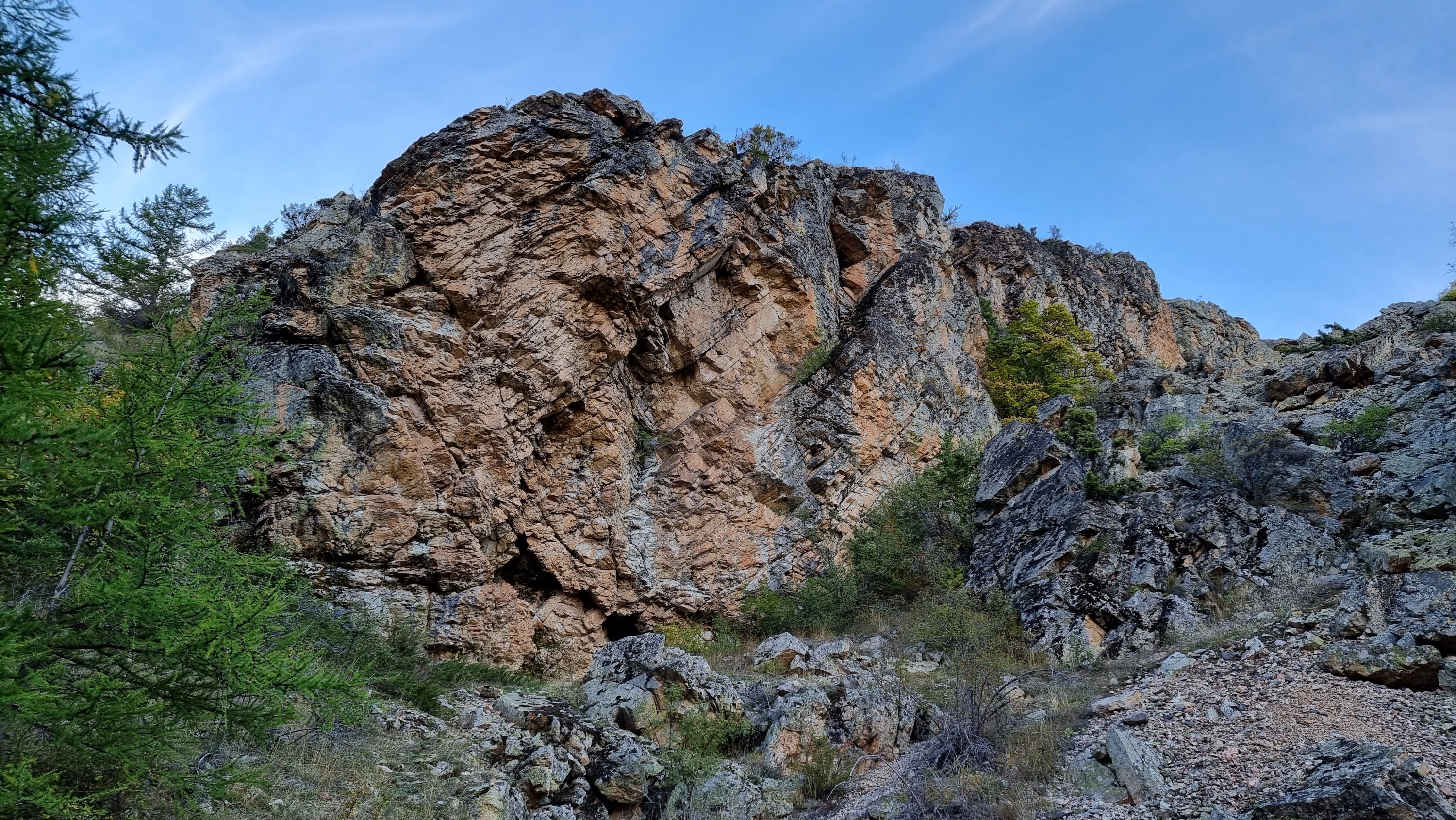 Heading back to the truck I reccied the new high-level sector: this is recommended to be accessed from above (and it’s a bit of a bushwhack from the Aiguilles). Here’s a couple of pictures of the crag and a sketch map of how to get there: