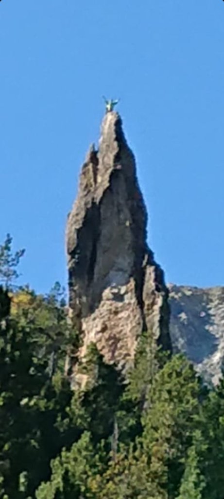 We returned a few days later, and headed up, despite the truck thermometer reading 7C in the sunny parking. There’s not much evidence of a path to start with, but follow your nose through the meadow and you will soon pick up a track. Top tip: Ignore the temptation to blast up the steep scree as soon as you spot the needle and instead keep faith with the track until you pick up some big cairns and take a pleasant zag to the crag (track below recorded on descent with the benefit of hindsight!):