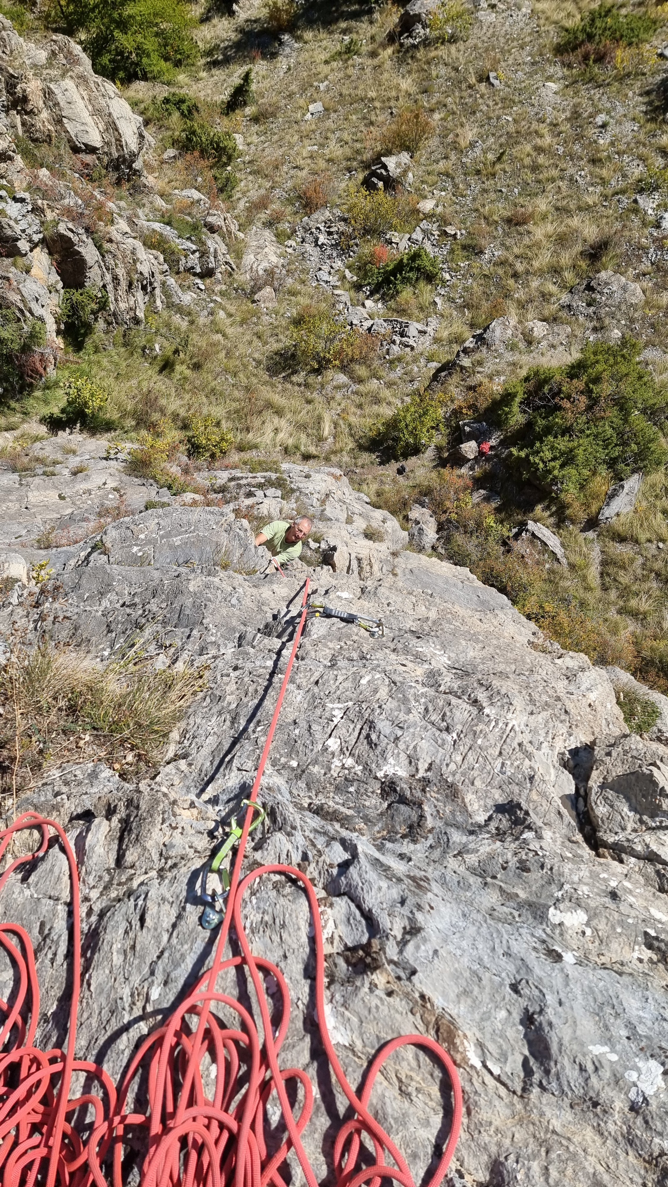 The rap route is set up for people using 2x50s but we got away with our single 80m by using the occasional intermediate rap point. All was going well until about 100m off the deck, when the rope got stuck behind a chockstone in the huge gully that cleaves the crag. Even with 20:20 hindsight it’s hard to see how you’d avoid this except by being lucky. Talking of lucky – guess who got to do an extra 6a+ pitch (P3 of Voie de les Martagans I think) – you just can’t get too much of a good thing! After a bit of shenanigans we were back down on terra firma. Time for celebratory beers and lentil and spinach curry chez nous.
