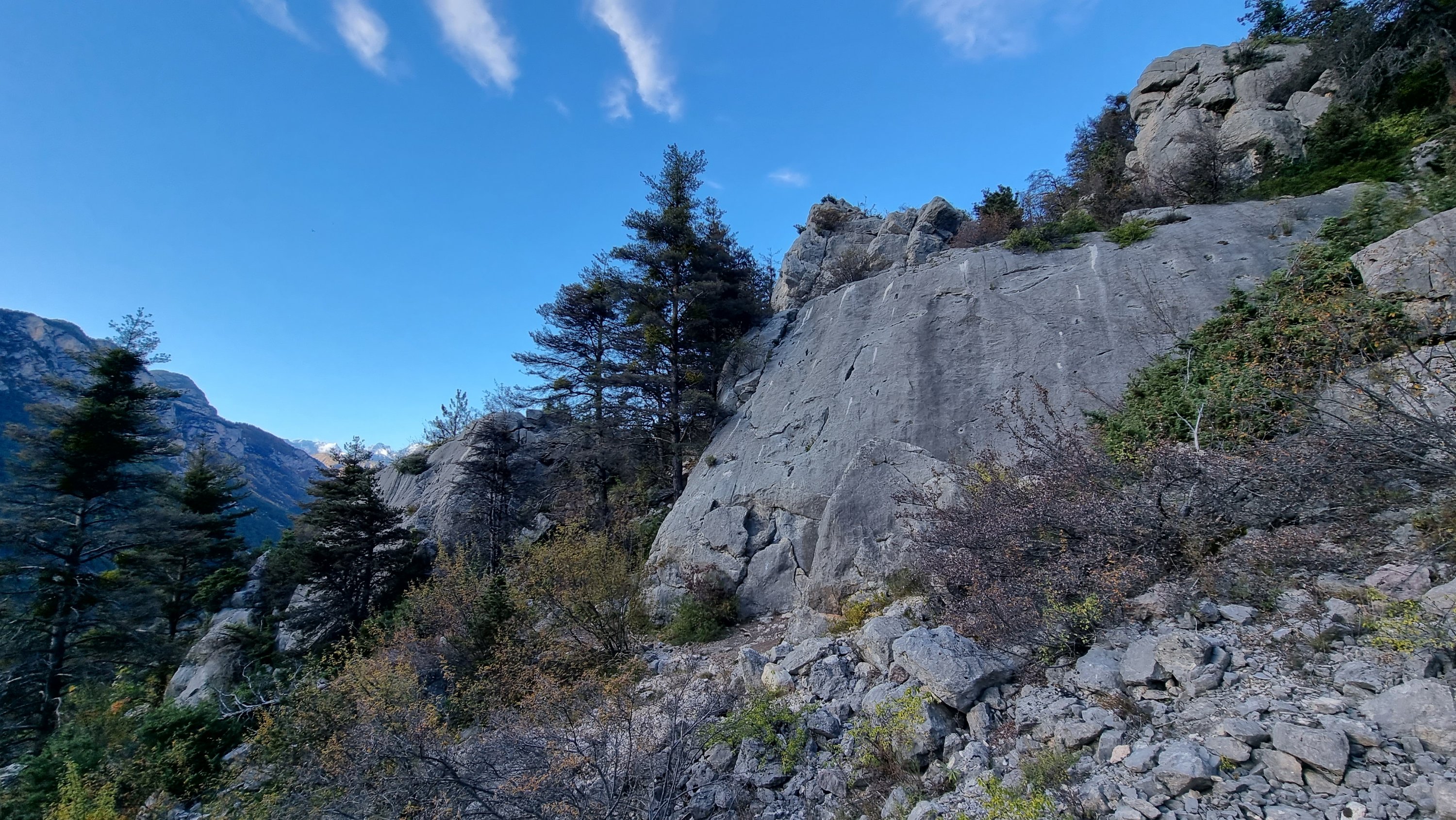 Here’s a strong local climber on the rightmost route Ecureuil Givre, 6a