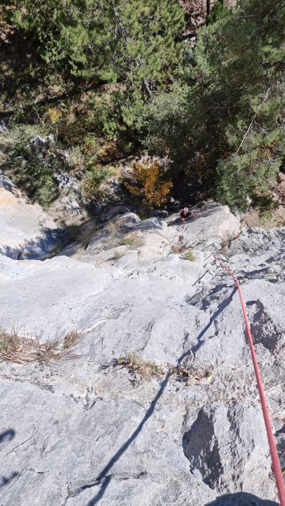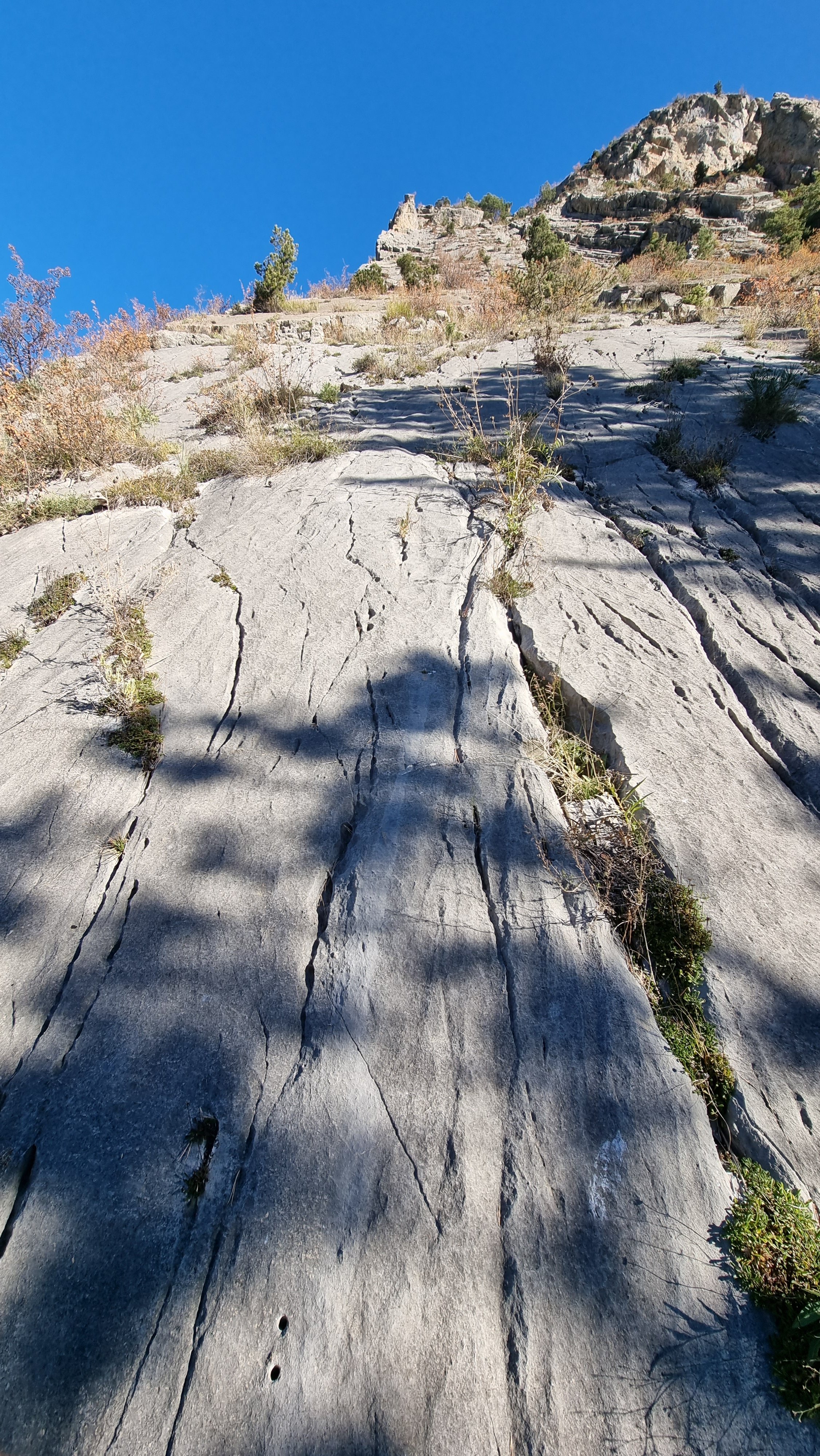 giving a balanced 100m or so, sustained at 6a/+. Our only previous encounter with La Grande Falaise had been some polished horrorshow single pitch routes at Secteur Clematites, so it was a relief to find Papa m’a Dit to be anything but… The rock and line have a real “mountain feel” with little sign of traffic. Tough for 6a+ though.