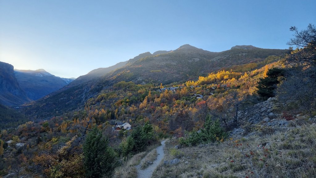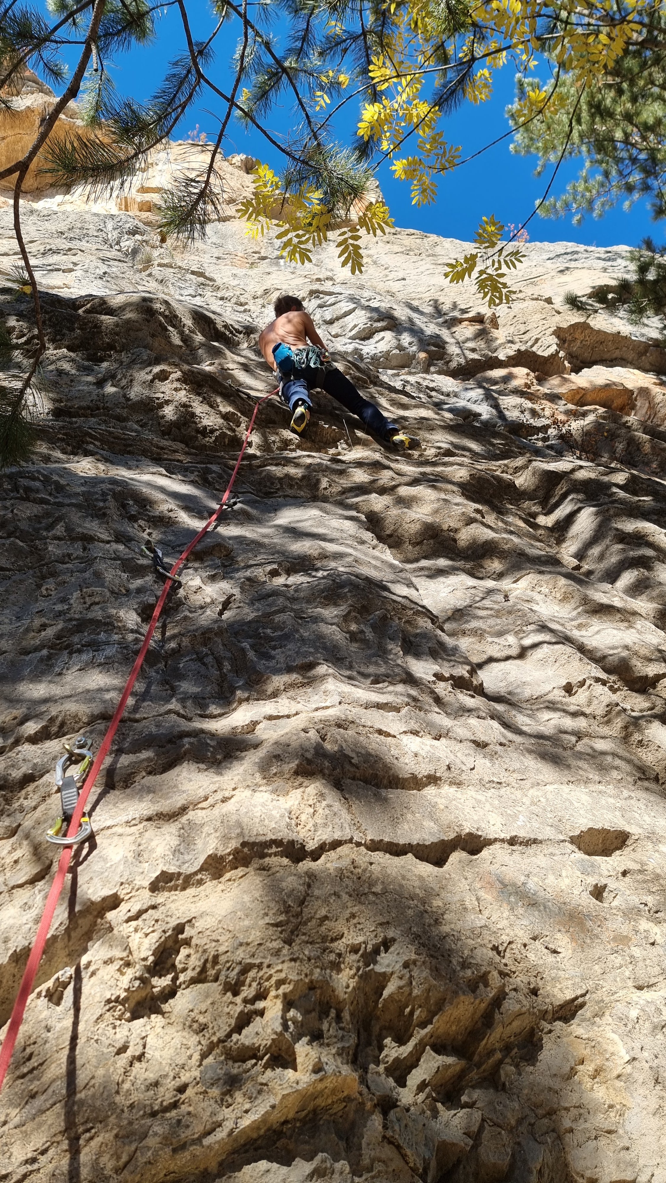 Further right again, on Secteur Solitude et Fournaise, the rock changed character again. Sculpted orange rock with traddy-looking lines. Assez Bronze was a good route to end the day on. Still toasty in full sun at 17:30 – you can forgive a bit of sandbaggery for the feeling of warmth on your back and the magical light of the setting sun picking out the autumn hues.