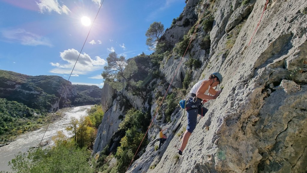 Happily we had the perfect next stop already lined up – Mike and Heidi have just settled into their new home near Uzès in the Gard region, and were open to receiving visitors 🙂 After heavy rain, the second day of the monsoon failed to materialise Chez M&H, leaving no excuse but to head out to recce some of the local climbing on offer.