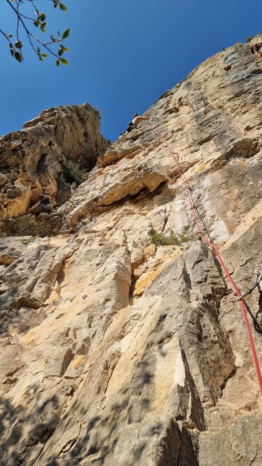 The crag isn’t too shabby either – an impressive sweep of striated limestone, about 30m tall and varying from bob-on vertical to properly steep!