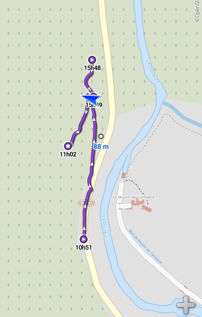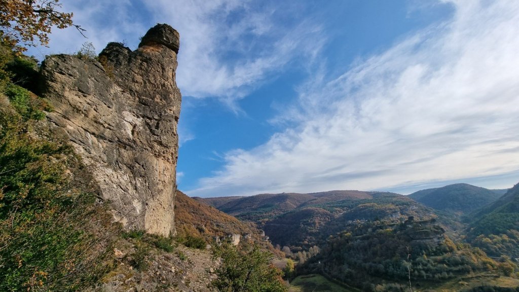 Access is straightforward – you park in a small gravel area (room for 3-4 cars) on the left side of the D991, about 300m north of the turning for the village of Cantobre. Walk a further 100m north along the road until you spot an obvious cairned path sloping gently up leftwards above the road. You can see the top of the crag on the skyline above from this point.