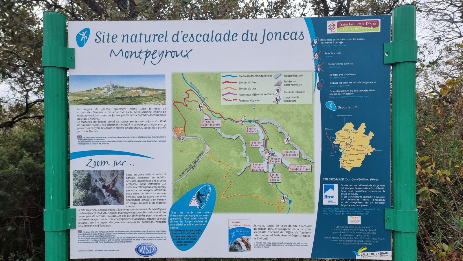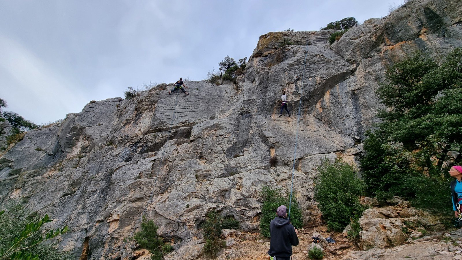 Blowing a hoolie on the tops, and not too sunny, so we headed to Le Joncas in the hope of finding some sheltered, sunny climbing. It’s a recently developed series of crags, either side of a dry gorge, giving options of shade and sun (we hoped!) to suit the conditions. You park at the top…