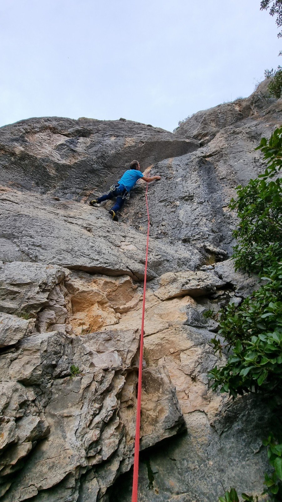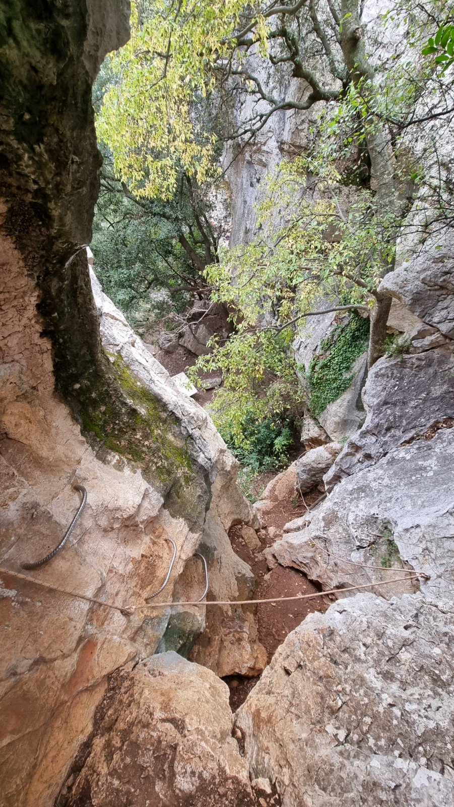 The sign carries dire warnings of difficult passages of via ferrata to access the crags. I’d always be one to support the use of appropriate safety equipment, and “be it on your head” to ignore the advice, but I would say that the lower gorge path is the most easily accessed with only a few bits of rope handrail and the odd metal rung to reach sectors Pensee Oblique and Sainte-Ethique. You can also get to the initiation sector at the top of the gorge without too much peril. Linking these and visiting the crags in between is quite fun, and worth the extra few minutes by way of an adventure on the way out, and might well be worth leaving your harness on for – see pics at the end of the post.