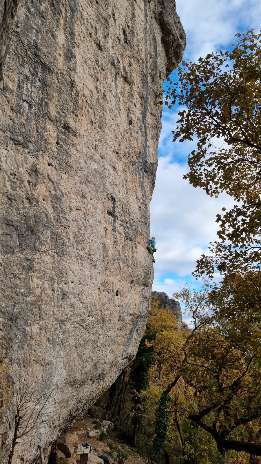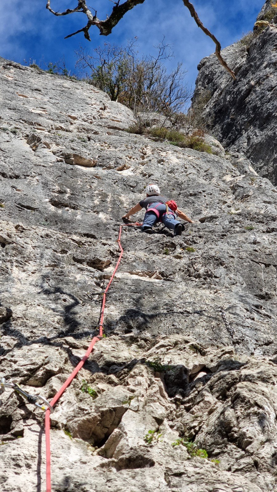 Helpful locals were happy to point out the best routes and their grades. Those on the big wall were a bit outside our pay grade (7b to 8a+), but about 30m left there’s a much friendlier “Mur a Cinq” with half a dozen routes in the 5b-6a range, some of which are around 35m long, and all the ones we did were very good.